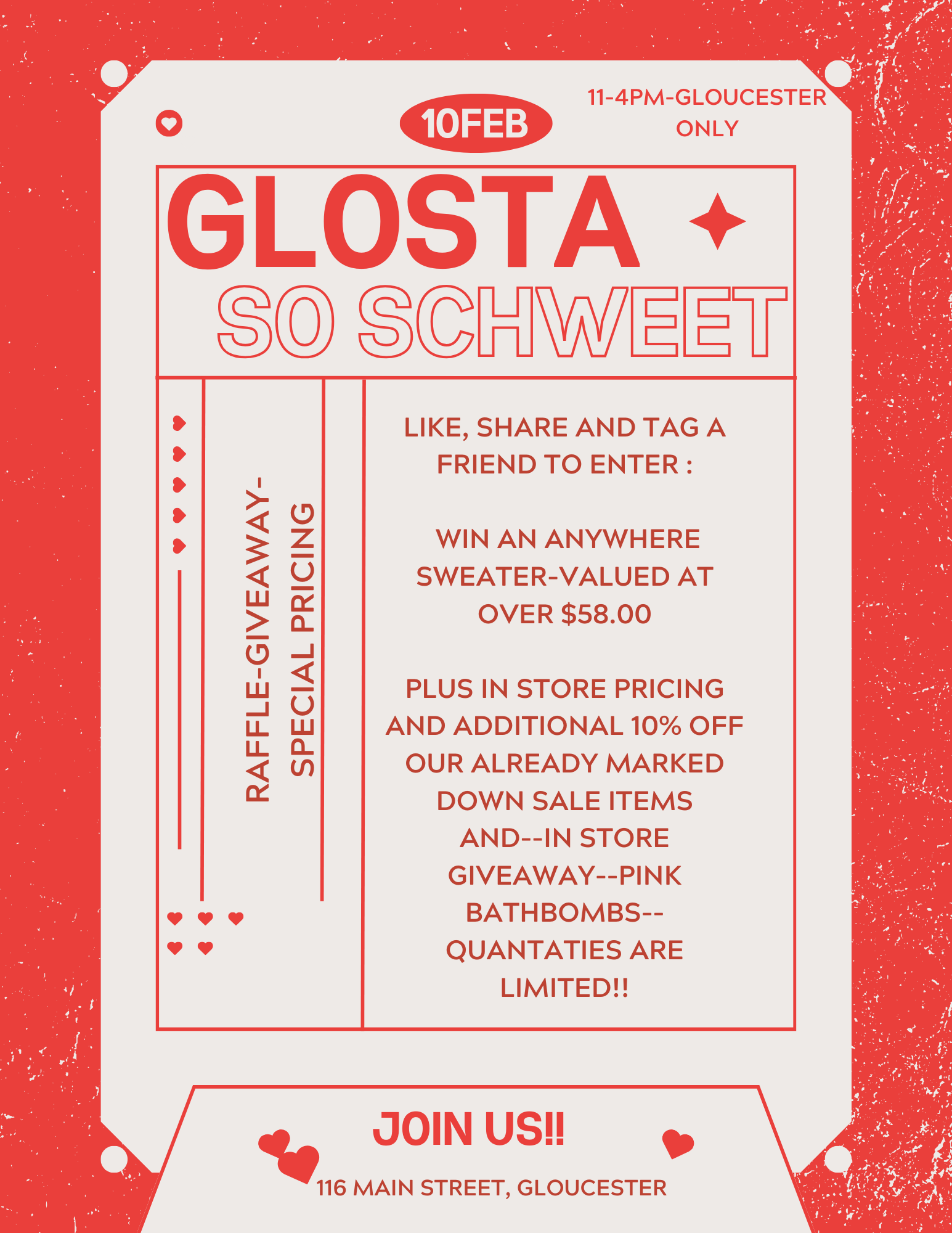 Create a flyer for a February 10 promotion at your spot. It should include a rough idea of what you’ll be handing out if anything (we’re suggesting something sweet or valentine related) and what your promotion for that day will be!