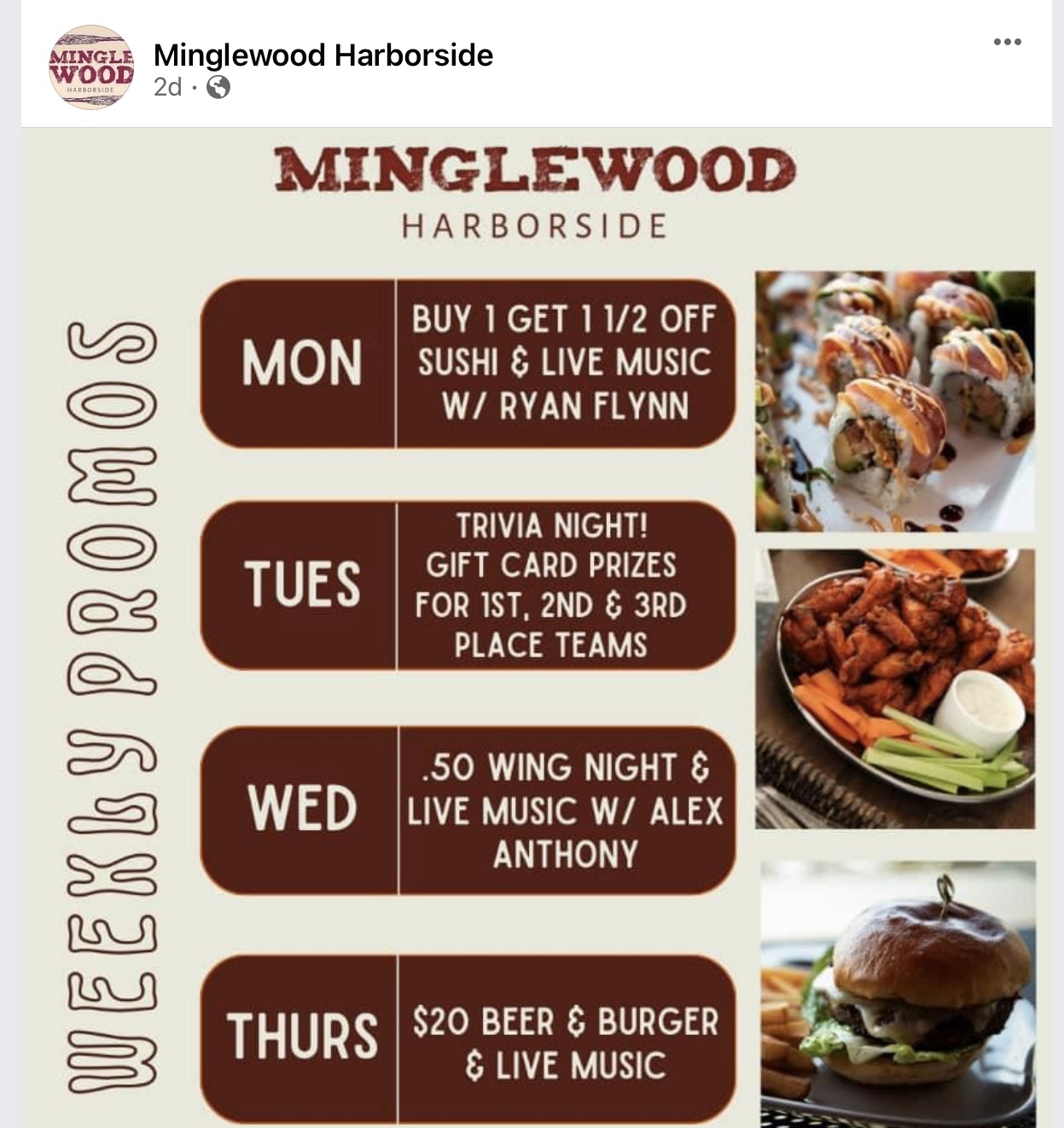 Our friend Susan L recently celebrated a birthday so she had a free dinner and dessert added to her Serenitee account. We decided to go to Minglewood Harborside on Rogers St to “cash in”. Bonus, it was wing night (GREAT deal, GREAT wings). In case you were unaware, Minglewood offers specials each weeknight you should consider when making dinner plans. It’s a warm and friendly atmosphere, made even more cozy with the fireplace and music. This evening, there was a special event in the Captains Courageous Room (something to keep in mind for your future events) so it was hopping in there. Hoping to see you there soon! Thanks Minglewood for a great evening with friends.