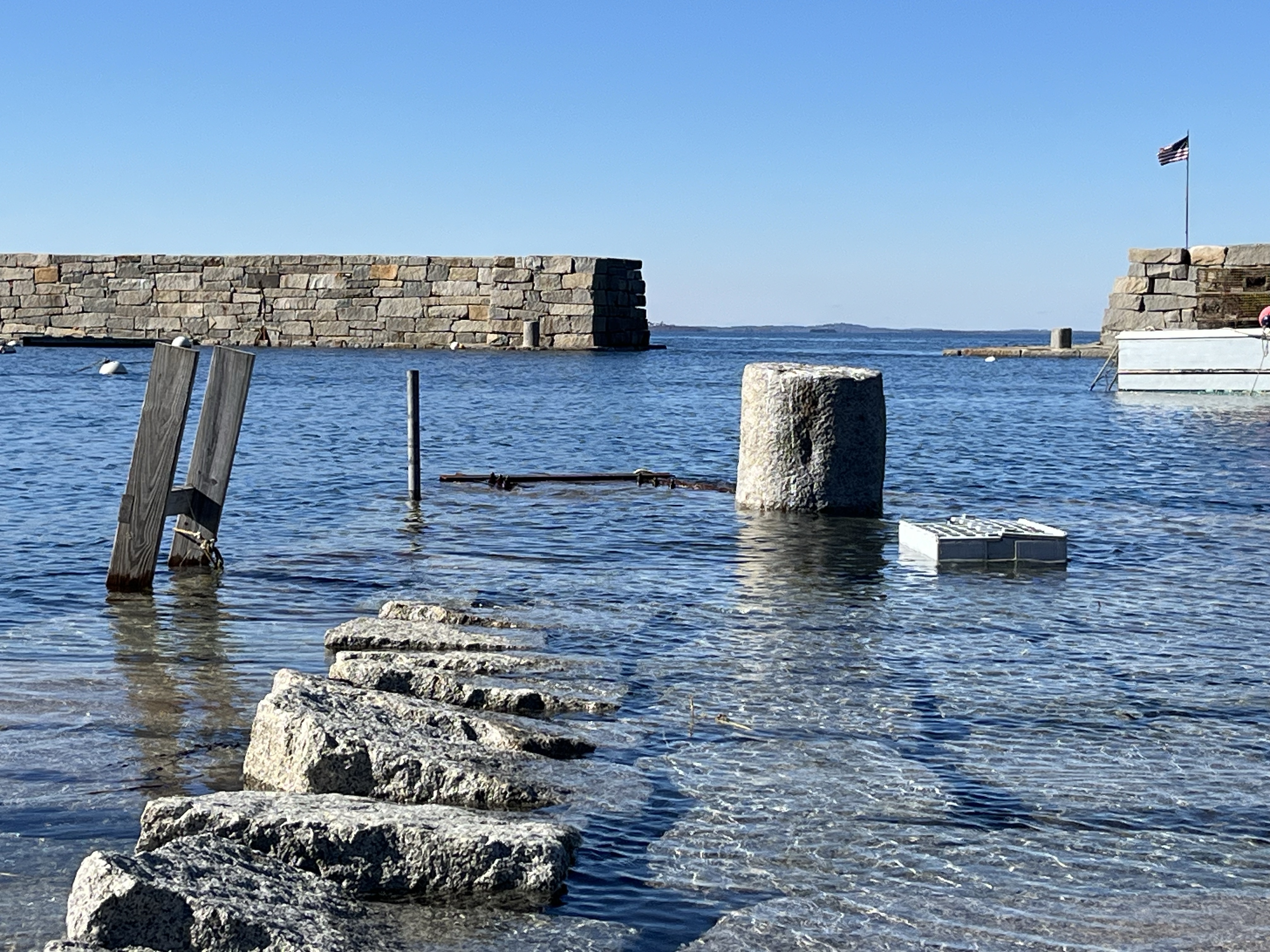 The tides had been running pretty high last week, so we went down to Lane’s Cove to check it out. It was just about high tide under a sunny sky and quite striking.