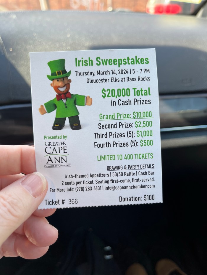 Joey and I got our Irish Sweepstakes ticket as offered by the Greater Cape Ann Chamber of Commerce. I am pretty sure this is the winning number, but there are several other prizes so get yours right at their office at 24 Harbor Loop. If the $100 buy in seems intimidating, split it with others like we do! Adds to the fun of the event.