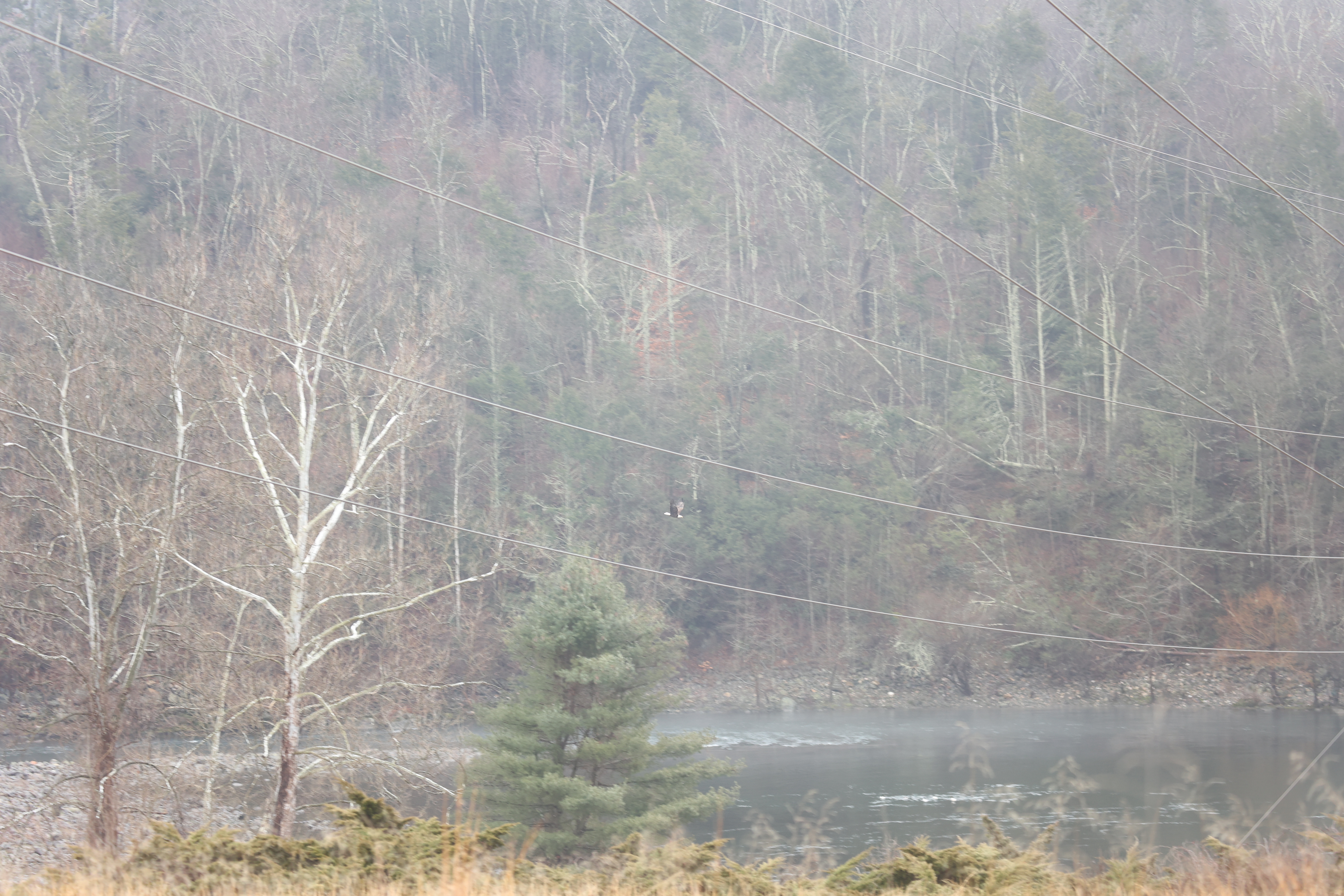 We took a 3 hour ride to the Shepaug Bald Eagle Observatory in Southbury CT one rainy gloomy day last week seeking out eagles. It’s a well designed observation area near the Shepaug Hydroelectric Power Station manned by knowledgeable and friendly volunteers. There are opportunities for bird watching above and beyond the majestic eagles too. That was a good distraction because it was gloomy and rainy so the eagles were deterred from visiting. We did observe one eagle flying in to hunt, feeding at waterside and in a tree but it was from a pretty good distance as you can see here. Can you see the eagle in flight?? (It’s there I promise you)