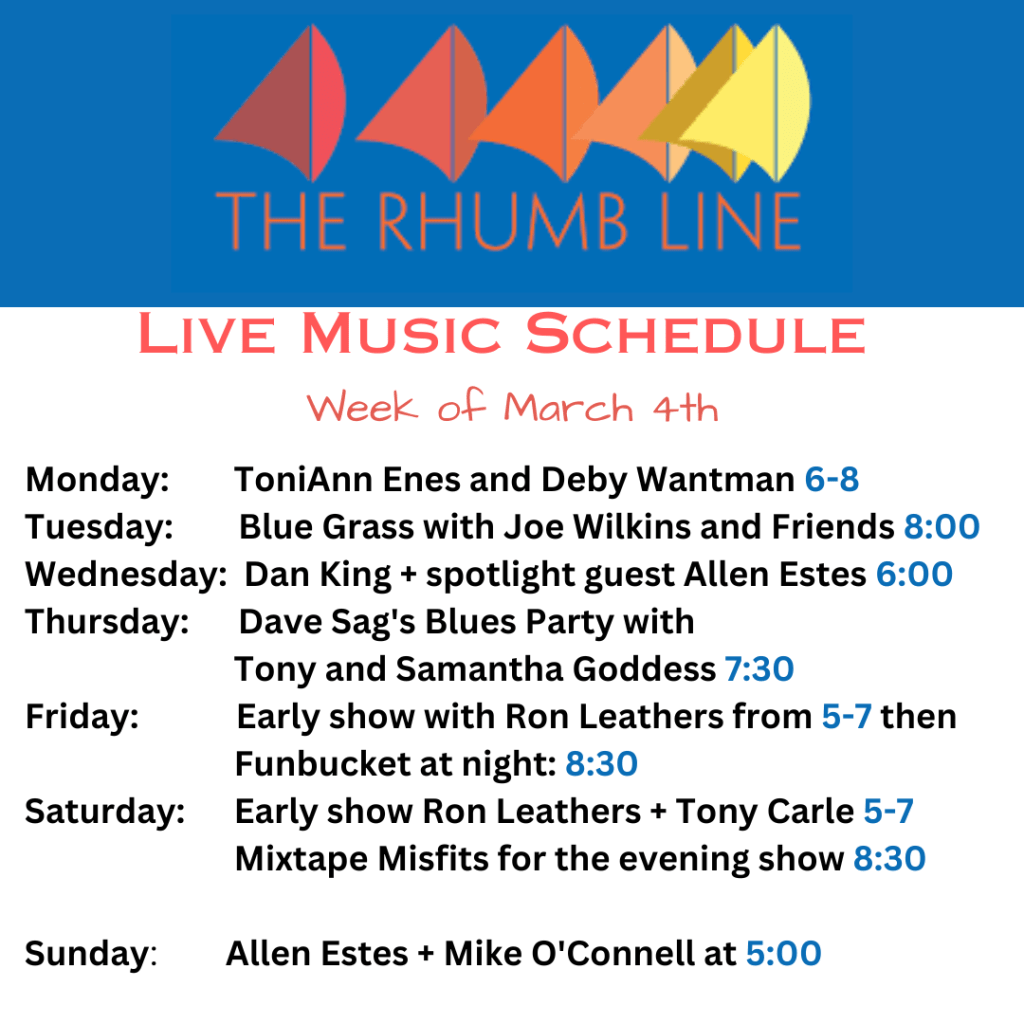Music this week at the Rhumb Line. As always, live music 7 days per week…9 shows in all. The Rhumb Line is at 40 Railroad Ave in Gloucester…conveniently located right across from the train station if you are coming from out of town.