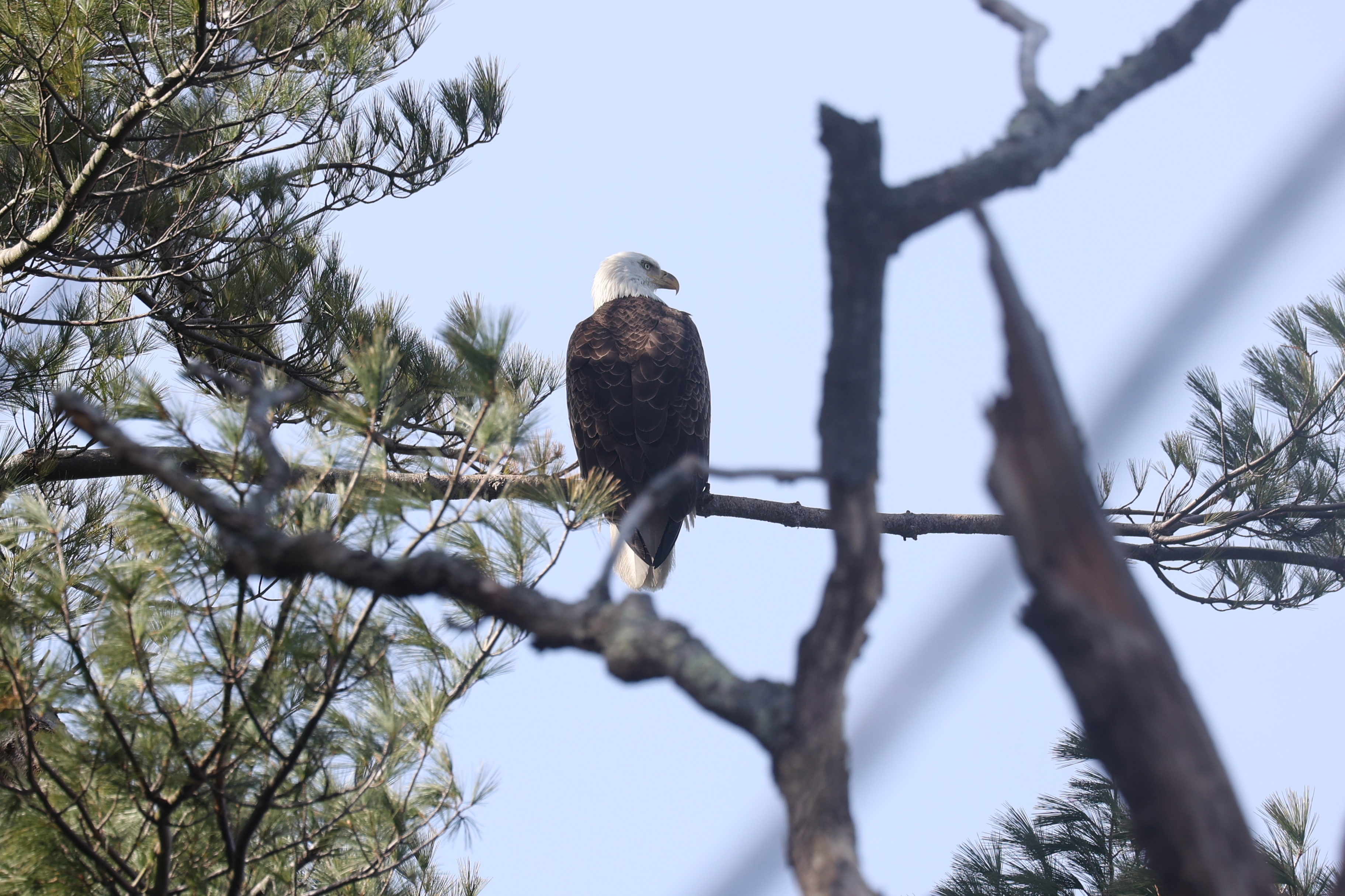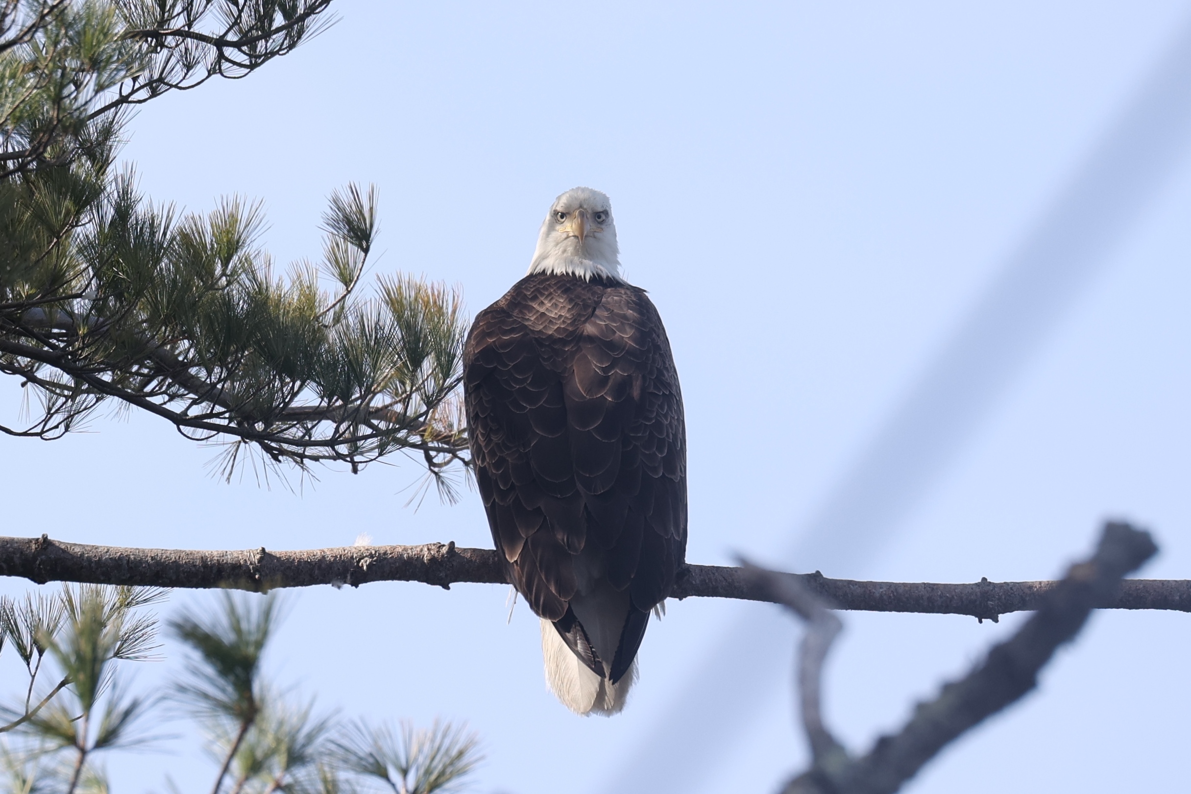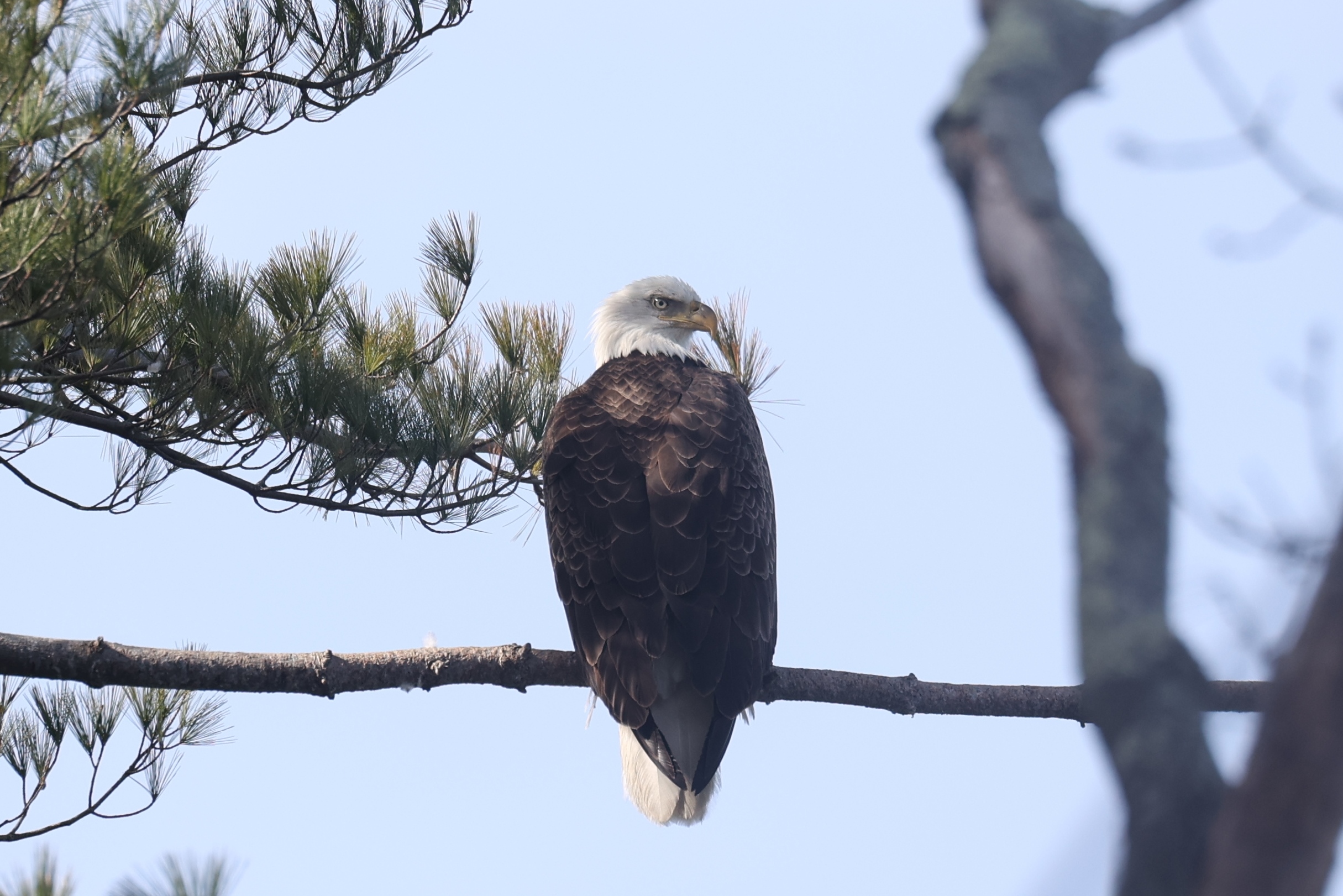 We saw our friend the adult eagle along Little River a few days ago enjoying the sun. My limited experience with eagles has taught me that each has its own personality and this particular eagle is a bit skittish. So I am extra careful to keep my distance and remain quiet in its presence so it won’t fly off before I’ve had a chance to watch for a while. It very clearly acknowledged my presence with the stare down you see here. It’s a little unnerving. However, it did stick around while I chatted with a neighbor out for a run with her dog for which I was grateful