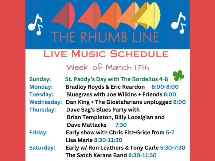 Here’s the live music schedule for the Rhumb Line for this week. Yesterday’s St. Patrick’s celebrations were so much fun! Thanks to all who helped to celebrate with us and THANK YOU to the Bordellos! Way to keep traditions alive in Gloucester, Fred Shrigley! We’re so lucky to have the Rhumb Line