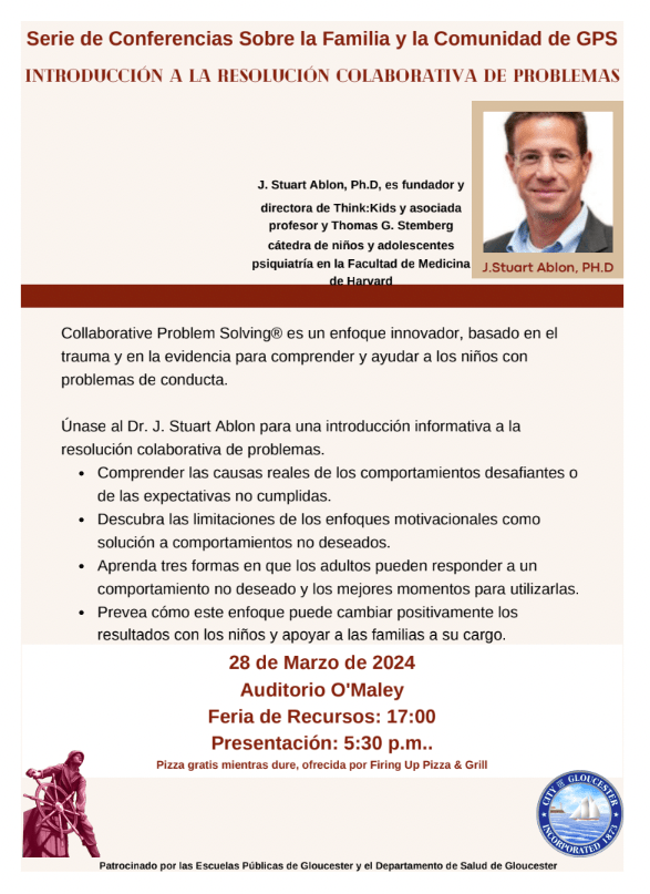 Dr. Stuart Ablon will present “Introduction to Collaborative Problem Solving” on Thursday, March 28, 2024 from 5:30-6:30 p.m. at the O’Maley Middle School Auditorium as part of the Gloucester Public Schools Family and Community Speaker Series.