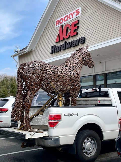 Hi Joey, where else to take a horse made of horseshoes than a hardware store. JKFmetal