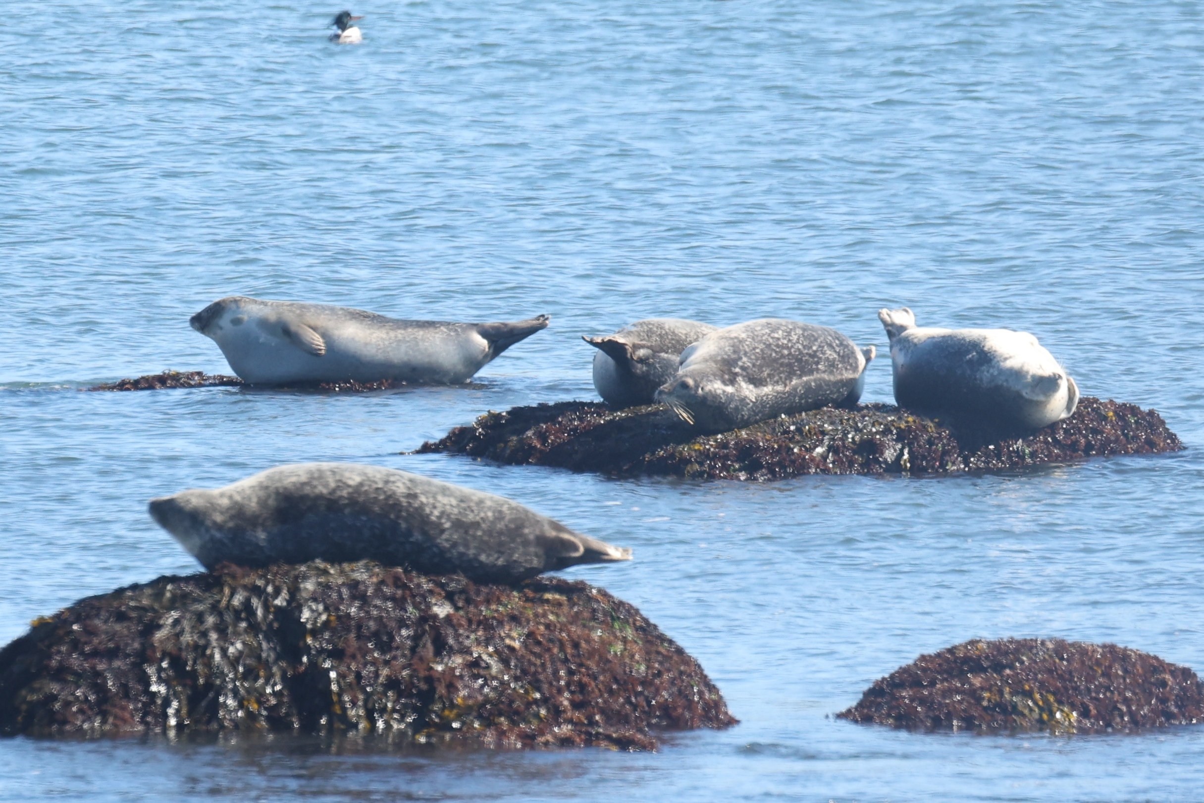 Family was visiting last weekend and some were interested in checking out the seals hauled out at low tide in the springtime sunshine, so we went down. There were maybe 10-12 seals enjoying a little break. It’s always fun to see them. There were also quite a few birds for our birdwatching visitors.
