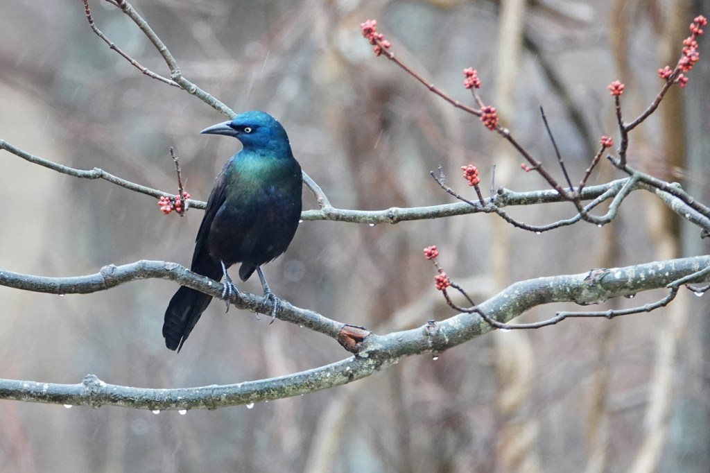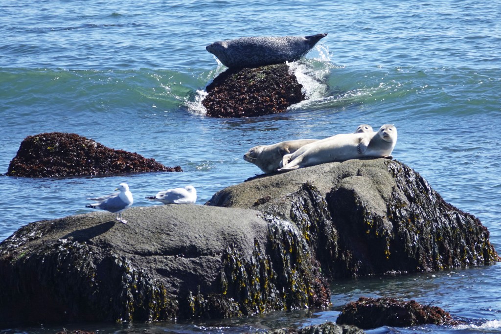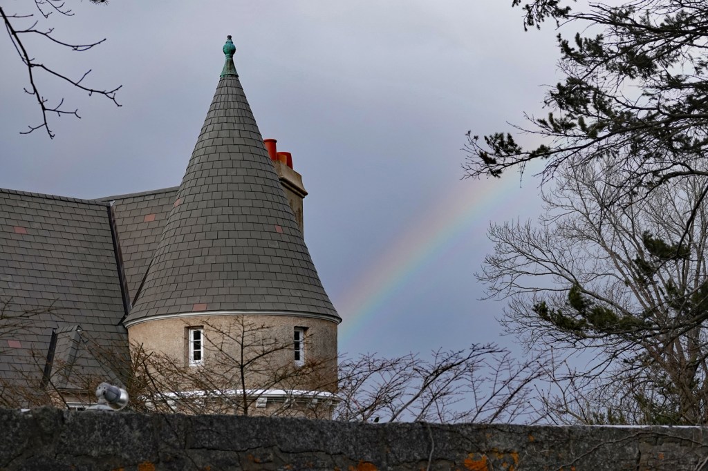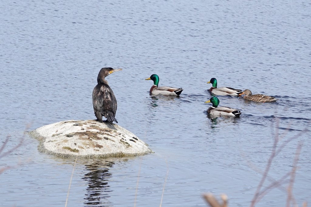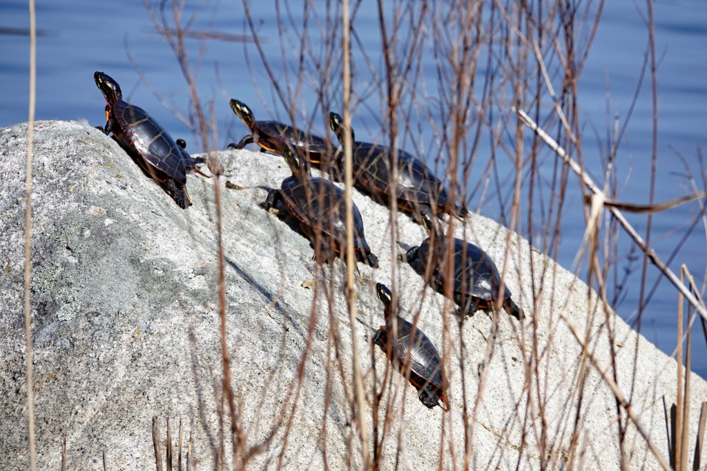 Cop Cormorant is directing traffic on Niles Pond.Spring sun means preening for Easter.Through the reeds, a group photo. SMILEPainted Turtles are marshalling forces. “Attack when I give the word.”A content Red-breasted Merganser couple parading the shoreline.But we dive for food most of the day and it’s exhausting.When the wind kicks up a chop we take refuge under the bushes.Embarrassed seals at Brace Cove, giving up a prime sunning rock to two Herring Gulls.Just missed a great photo of a wet River Otter cantering by under our bird feeder.Overhead, there’s competition and a pecking order at the feeder.A curious Common Grackle watches the activity, oblivious to the rain.An upside to Spring rains is the rainbows.