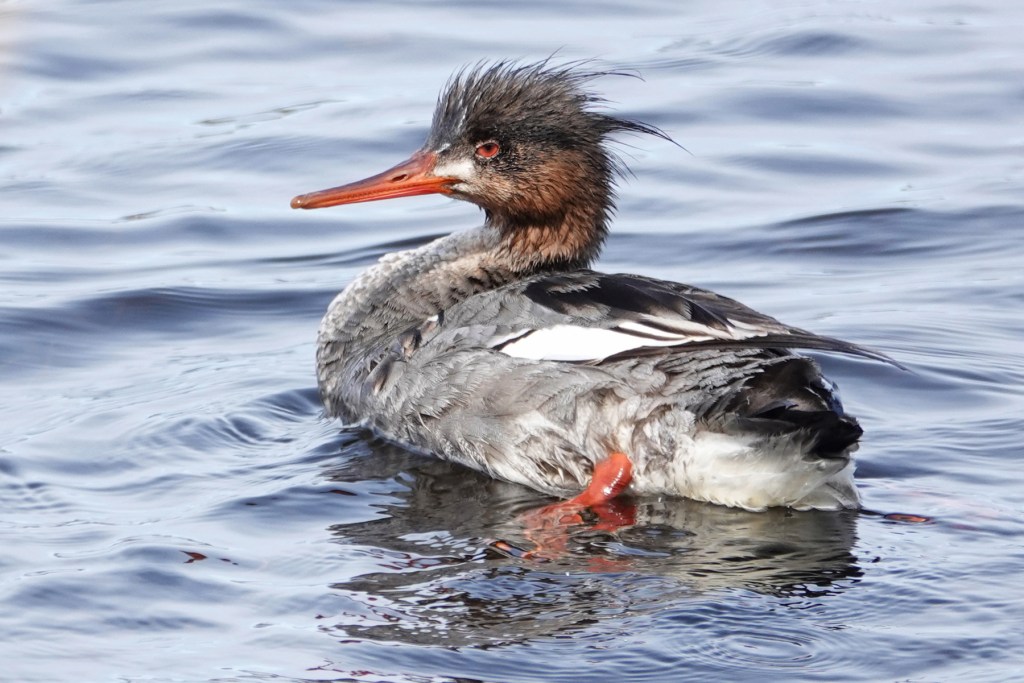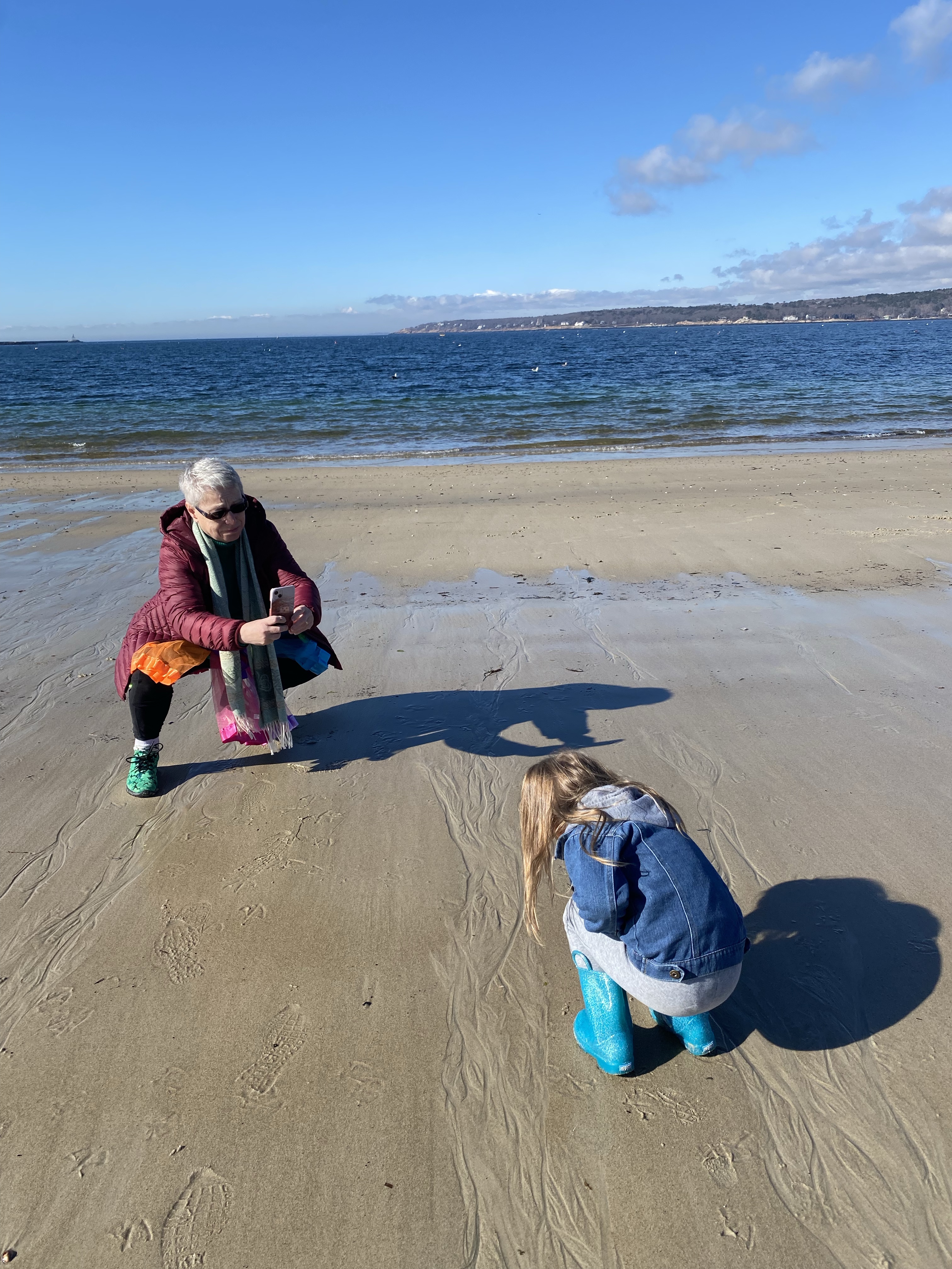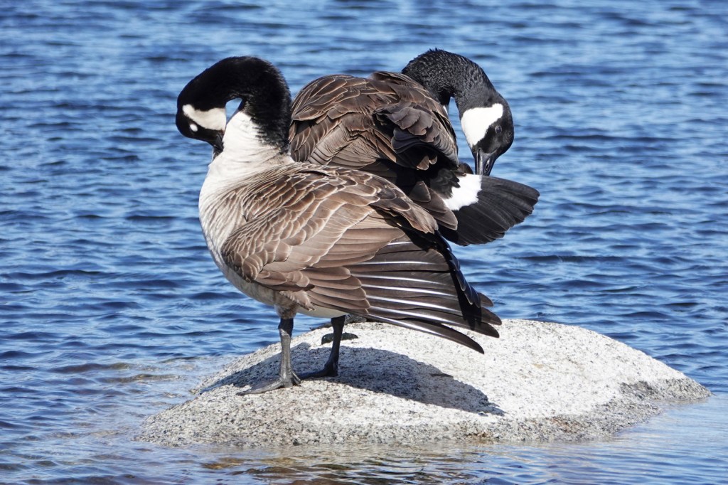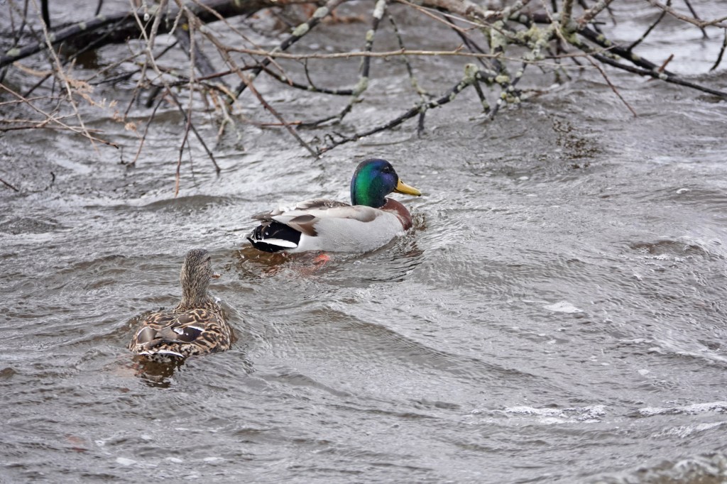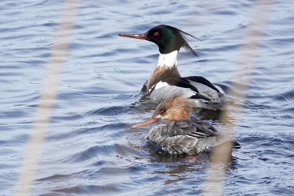 Cop Cormorant is directing traffic on Niles Pond.Spring sun means preening for Easter.Through the reeds, a group photo. SMILEPainted Turtles are marshalling forces. “Attack when I give the word.”A content Red-breasted Merganser couple parading the shoreline.But we dive for food most of the day and it’s exhausting.When the wind kicks up a chop we take refuge under the bushes.Embarrassed seals at Brace Cove, giving up a prime sunning rock to two Herring Gulls.Just missed a great photo of a wet River Otter cantering by under our bird feeder.Overhead, there’s competition and a pecking order at the feeder.A curious Common Grackle watches the activity, oblivious to the rain.An upside to Spring rains is the rainbows.