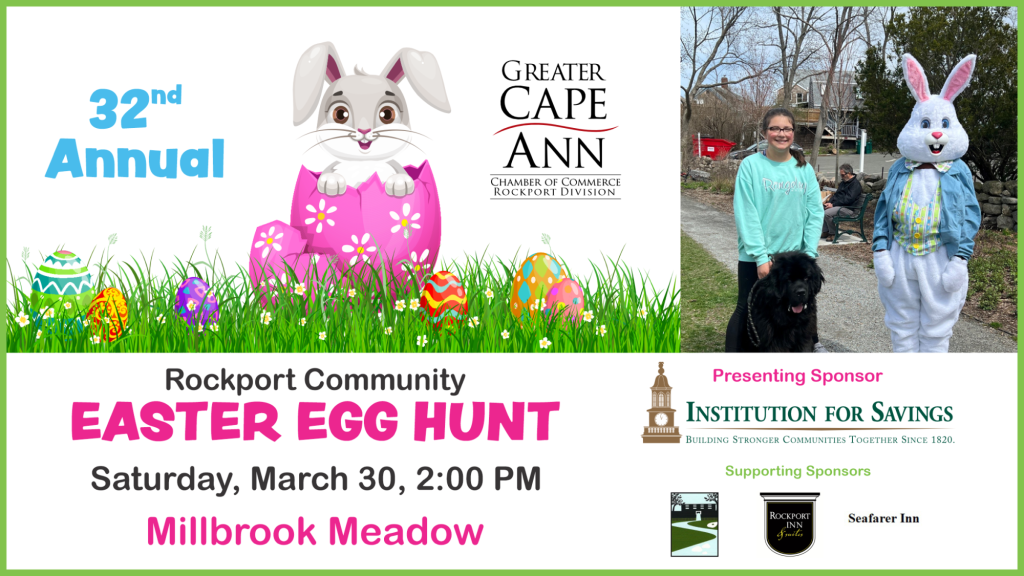 The Rockport Division of the Greater Cape Ann Chamber of Commerce will hold the 32nd annual Rockport Community Easter Egg Hunt on Saturday, March 30 at 2 PM. The event is for the children of the town – preschoolers through grade one – and will take place at Millbrook Meadow, Beach Street, Rockport.