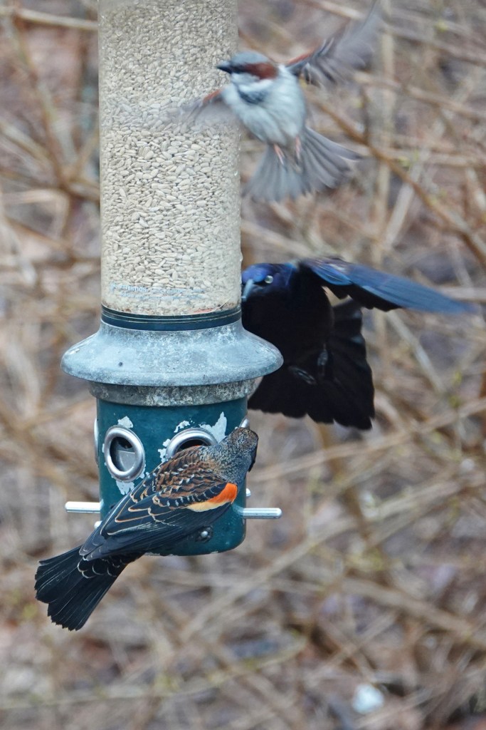 This is to answer a question from a viewer – I also wondered what this bird was at the bottom of the bird feeder photo. It didn’t look dark enough for a Red-winged Blackbird, but our ornithologist daughter assured us it is, but is a one year old male.