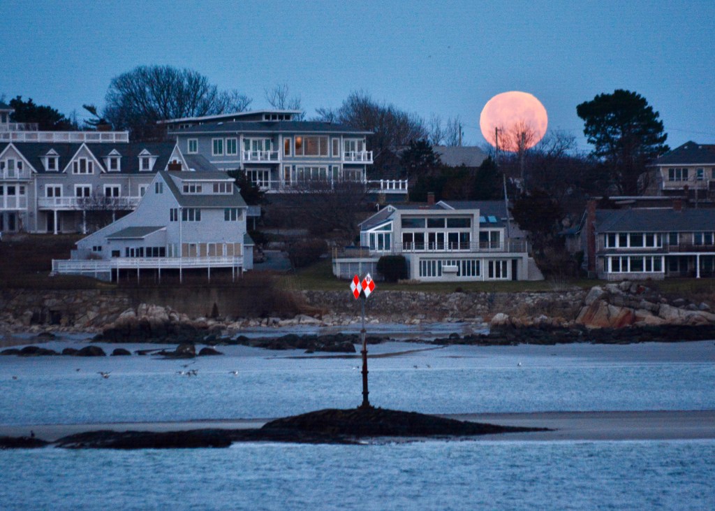 Last Monday’s full moon was a reminder of the upcoming “partial” solar eclipse expected to be visible in Gloucester April 8 beginning at 2:16 PM and reaching the maximum on 3:30 PM (https://www.timeanddate.com/eclipse/in/usa/gloucester?iso=20240408). Monday’s photo of the moon setting was at 6:30 AM, shortly after low tide, looking across the Annisquam River toward Wingaersheek Beach.