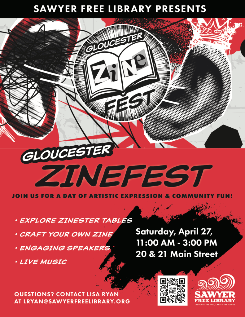 The SAWYER FREE LIBRARY is excited to announce the inaugural GLOUCESTER ZINE FEST, taking place on Saturday, April 27, from 11 am to 3 pm at both 20 and 21 Main Street in Gloucester, MA. The festival, in celebration of the Library’s new zine collection, zine-making, and zine culture, promises a day filled with artistic expression, community engagement, and fun for all ages. It is free and open to everyone to attend and enjoy with free giveaways for the first 200 attendees.
