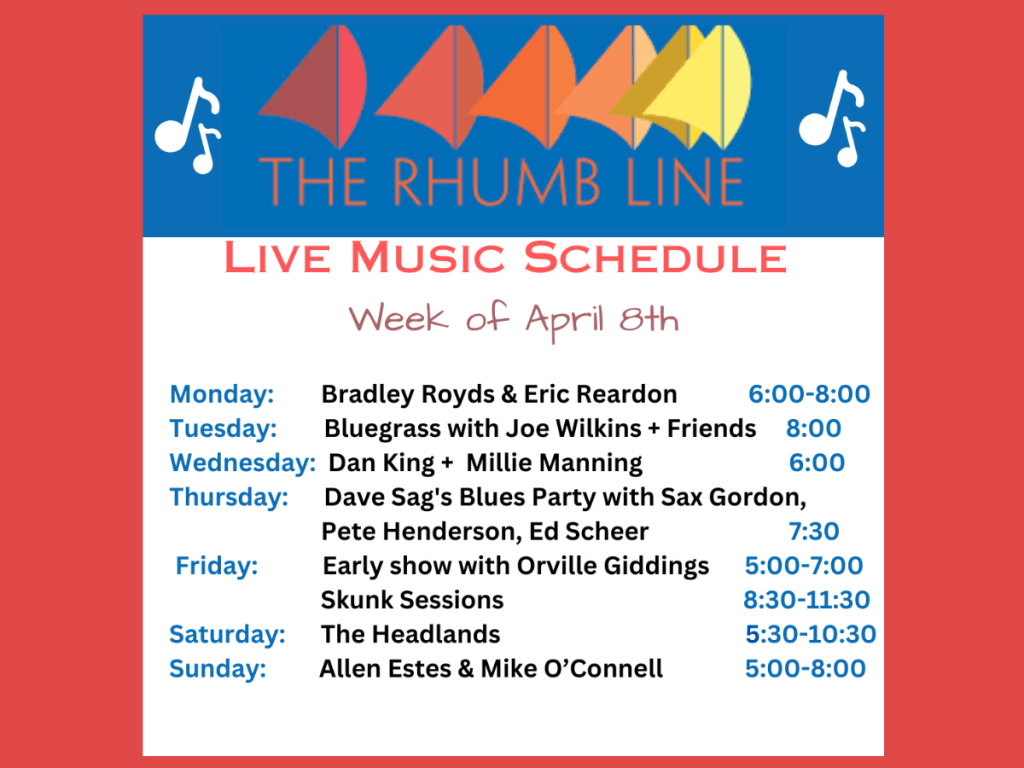 Here’s this week’s live music schedule for the Rhumb Line. Come on down!