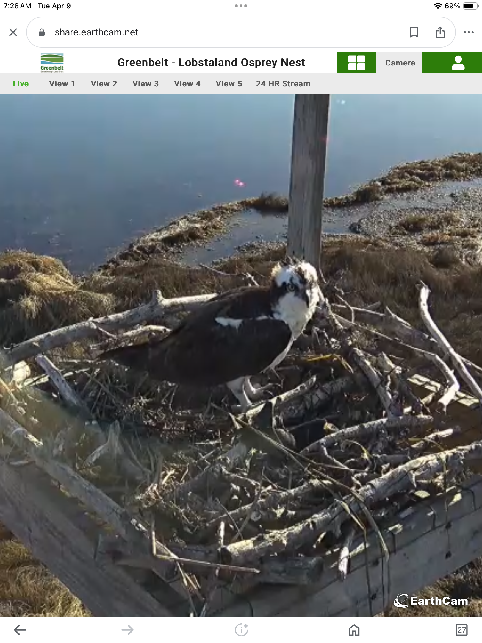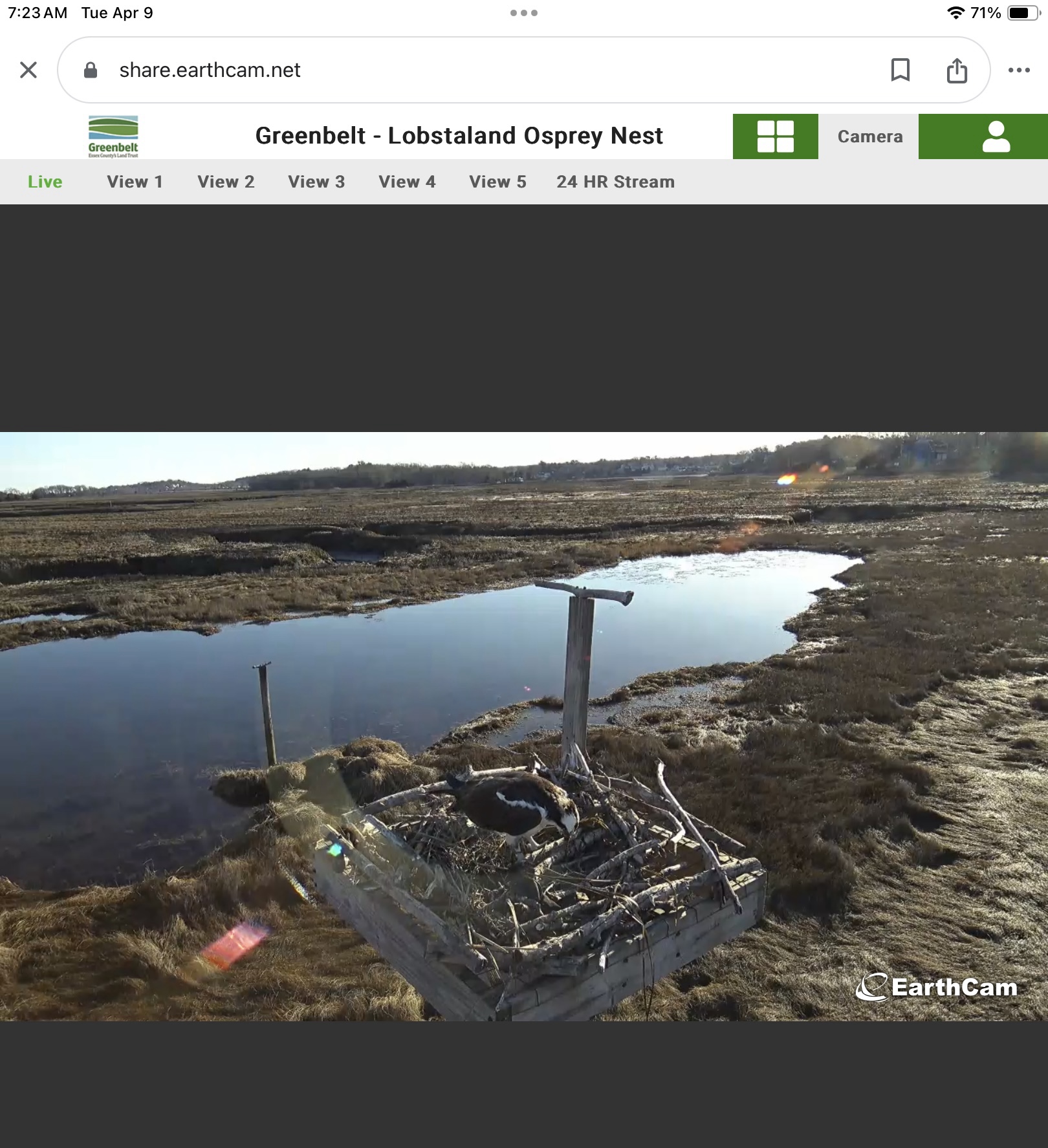 I was very excited to see some activity in the Osprey nest near Lobsta Land through the Osprey Cam provided by Essex Greenbelt (link here). If you follow the notes provided (scroll down for the latest additions), it seems the experts are unclear on which osprey this might be, but it’s very exciting to know they are starting to return to the nesting areas. Keep your eyes peeled! We should expect to see a couple sometime soon. These are screenshots from this morning.