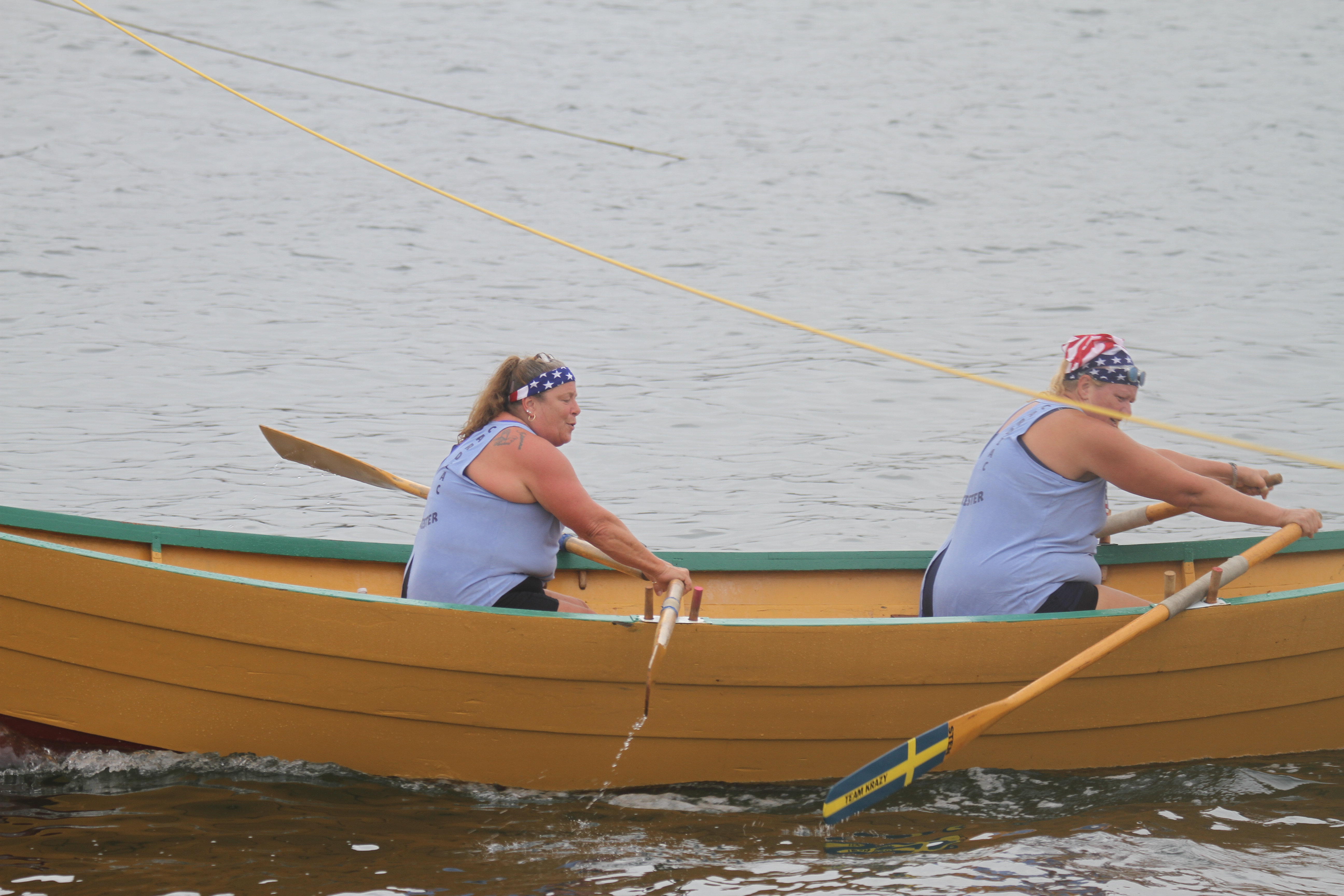 We attended the annual International Dory Races hosted by Gloucester this morning under a mantle of showers and fog. We could not stay for all of the races but I can report that in the Exhibition Race, the Canadian Senior Women came across the finish line first. For the Juniors, the Gloucester team of Kaden and AJ Lewis finished ahead of the Canadians Parker Spindler and Ryan Hirtle. The Mixed Double race saw Canadians Lisa Tanner and Robert Fox cross the line ahead of Jimmy Tarantino and Sarah LeWine. These results and additional details are included here. (thanks Sara Gray!). Welcome to our Canadian friends! Back to Nova Scotia in August.