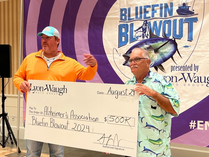 Last night, at the Beauport Hotel, another giant check was presented to the Alzheimer’s Association from this year’s Bluefin Blowout. This year’s check was for a staggering $500,000….bringing the total raised by this fantastic event to over $2.2 million since the tournament’s inception. Those who give gather.