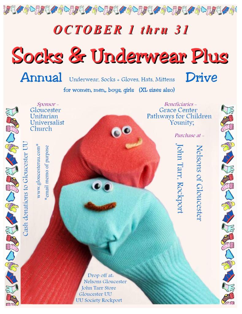 The fourth annual Socks and Underwear drive will run for the month of October 2024, sponsored by the Gloucester Unitarian Universalist Church. Donations of new socks, underwear, hats, gloves and mittens for women and men, girls and boys will benefit the clients of three local non-profits: Pathways for Children, Younity and The Grace Center. Two local businesses, Nelsons of Gloucester and The John Tarr Store of Rockport, will participate.