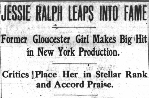Jessie Ralph was a well known actress who lived and died in Gloucester. She was well known as a character actress in several films you should recognize: David Copperfield (1935) and Camille (1936) among others. She retired after a leg was amputated and died a few years later in 1944. She is buried at Mt. Pleasant Cemetery. I find it fascinating to think about her life span which started when she was born during the Civil War and died before the end of World War II. On a lark one day, I used the Sawyer Free Library online database for the Gloucester Daily Times and entered her name. Following you will find some example of articles written about her locally. Facebook also provides “10 Things You Should Know About Jessie Ralph” (honestly, you can find just about anything on Facebook it seems. )