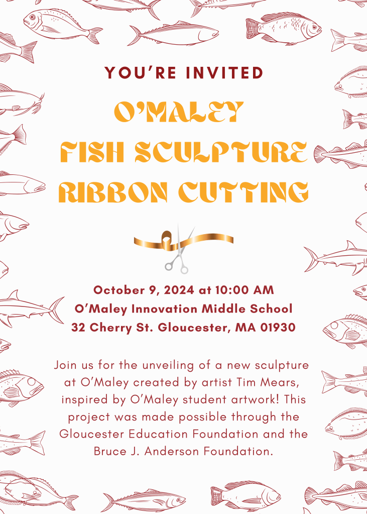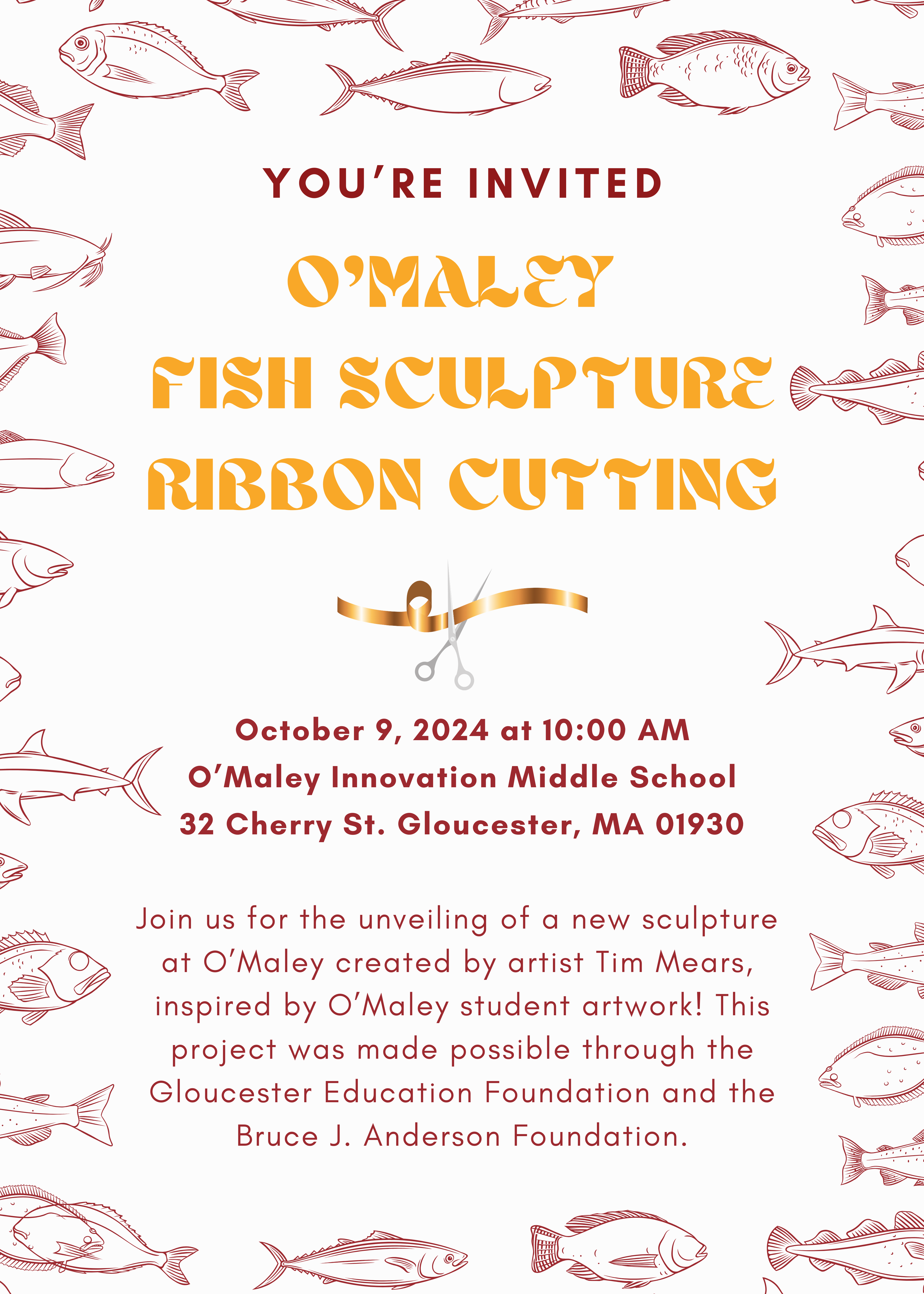 Local artist Tim Mears has created a gorgeous new installation at O’Maley Innovation Middle School, in collaboration with O’Maley students. Read about this project in today’s Gloucester Daily Times, and join us for the ribbon-cutting next Wednesday October 9 at 10am!