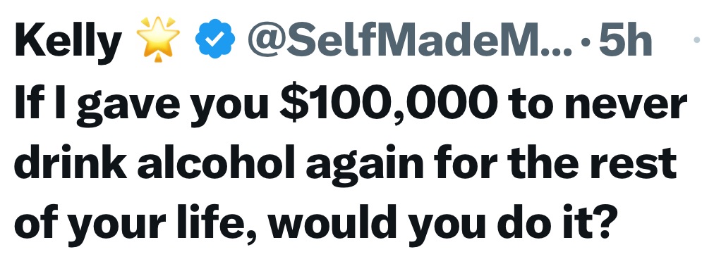 I found this question interesting. If someone gave you $100,000 to never drink alcohol again for the rest of your life would you do it?