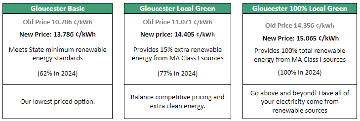 No action is necessary to receive the new pricing for your current Gloucester supply option, if listed above. For example, if you currently use Gloucester Basic, you will automatically receive the new price for Gloucester Basic listed above.