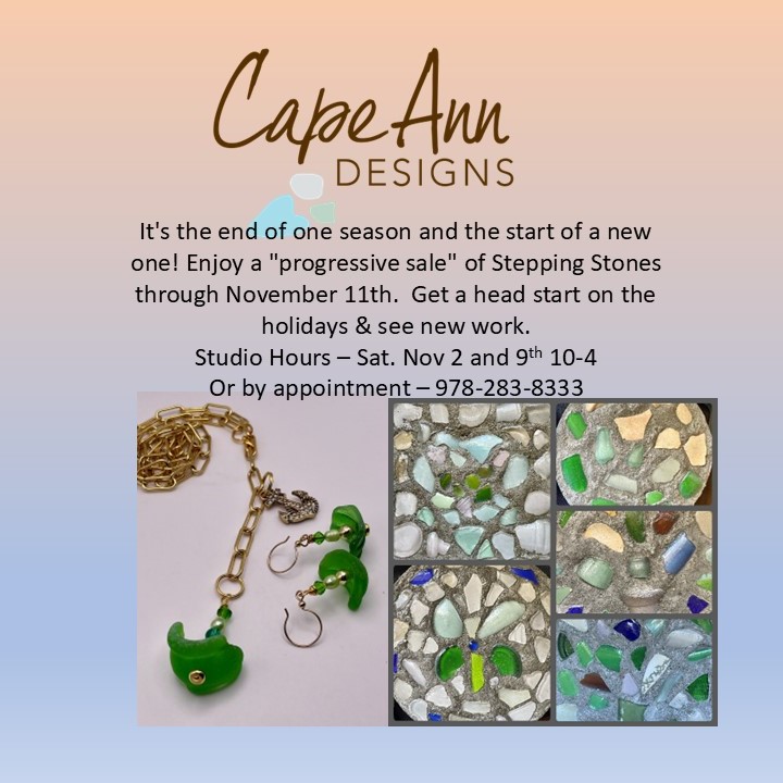 Don’t miss out on the final days of the progressive sale of Sea Glass Stepping Stones at the Cape Ann Designs Studio. Open Saturday, November 9 from 10-4 – 44 Thurston Pt. Rd. Back Barn.
