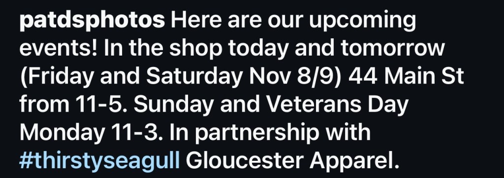 Here are our upcoming events! In the shop today and tomorrow (Friday and Saturday Nov 8/9) 44 Main St from 11-5. Sunday and Veterans Day Monday 11-3. In partnership with Pat D’s Photos