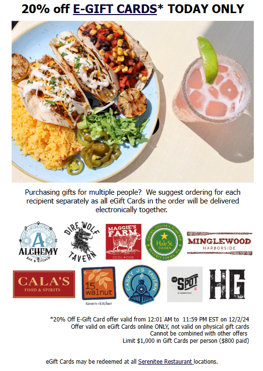 | 20% off E-GIFT CARDS* TODAY ONLY |
