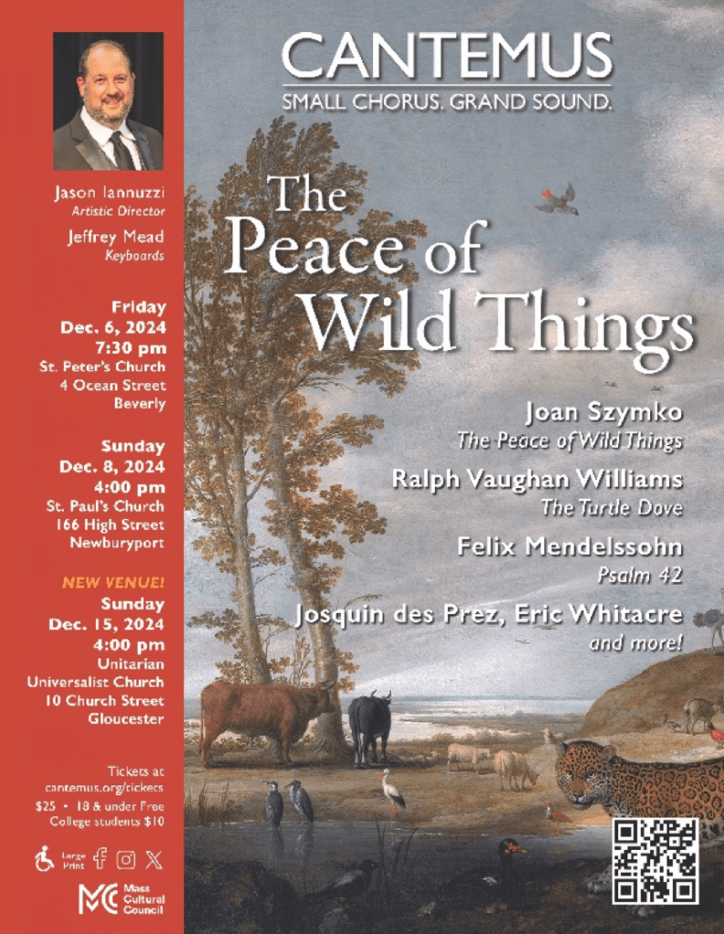 Cantemus Chamber Chorus, with 42 members from across the North Shore, will present concerts in December that share “The Peace of Wild Things.” Founded in 1982, Cantemus is well known beyond Cape Ann. This year it will perform for the first time in Gloucester—on Sunday, December 15 at 4:00 p.m. at the Unitarian Universalist Church, 10 Church St.