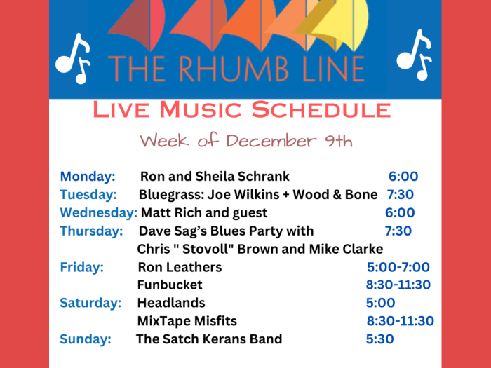 Here is this week’s music line up at The Rhumb Line. As always, live music 7 days per week! See you there!