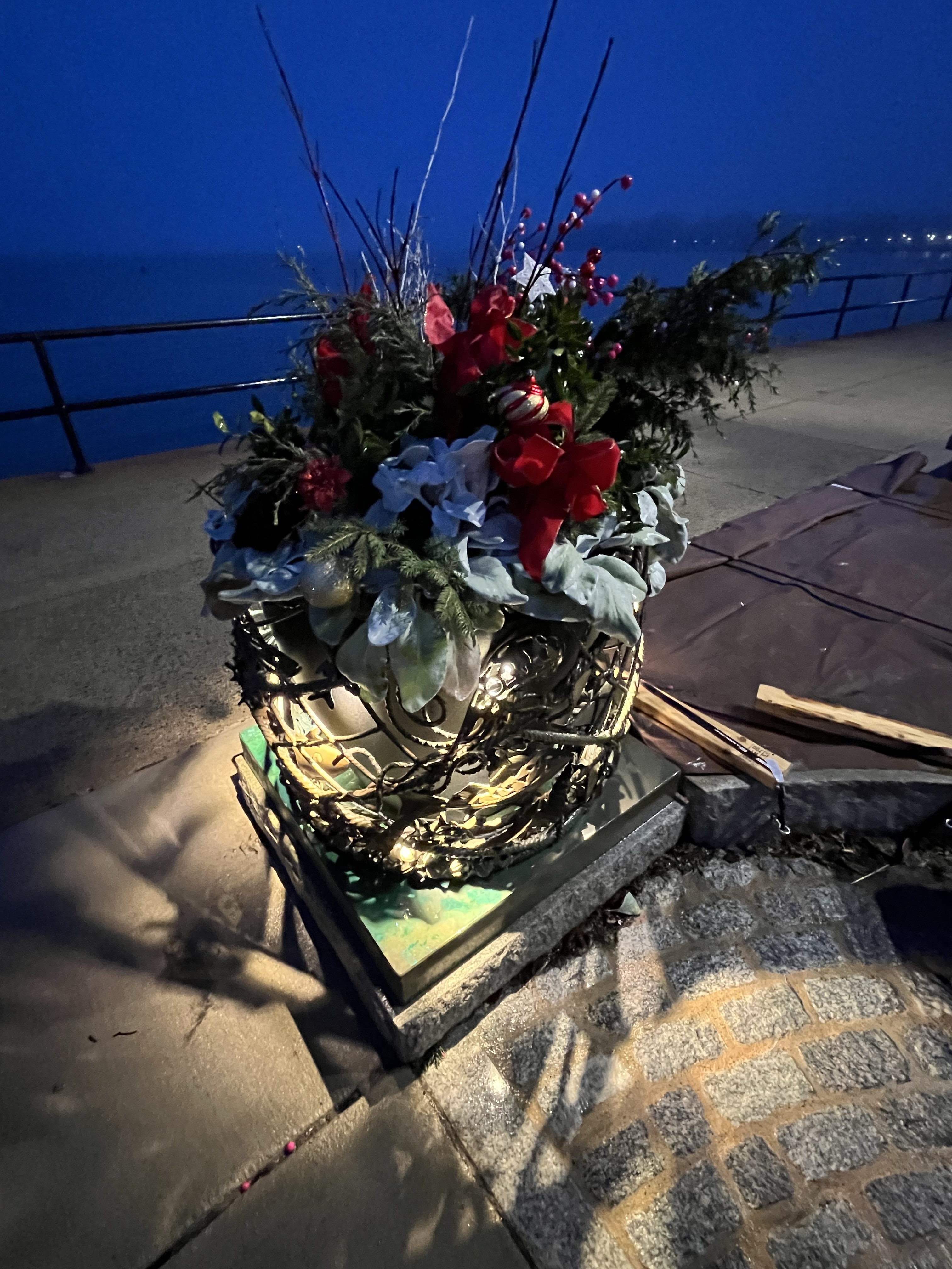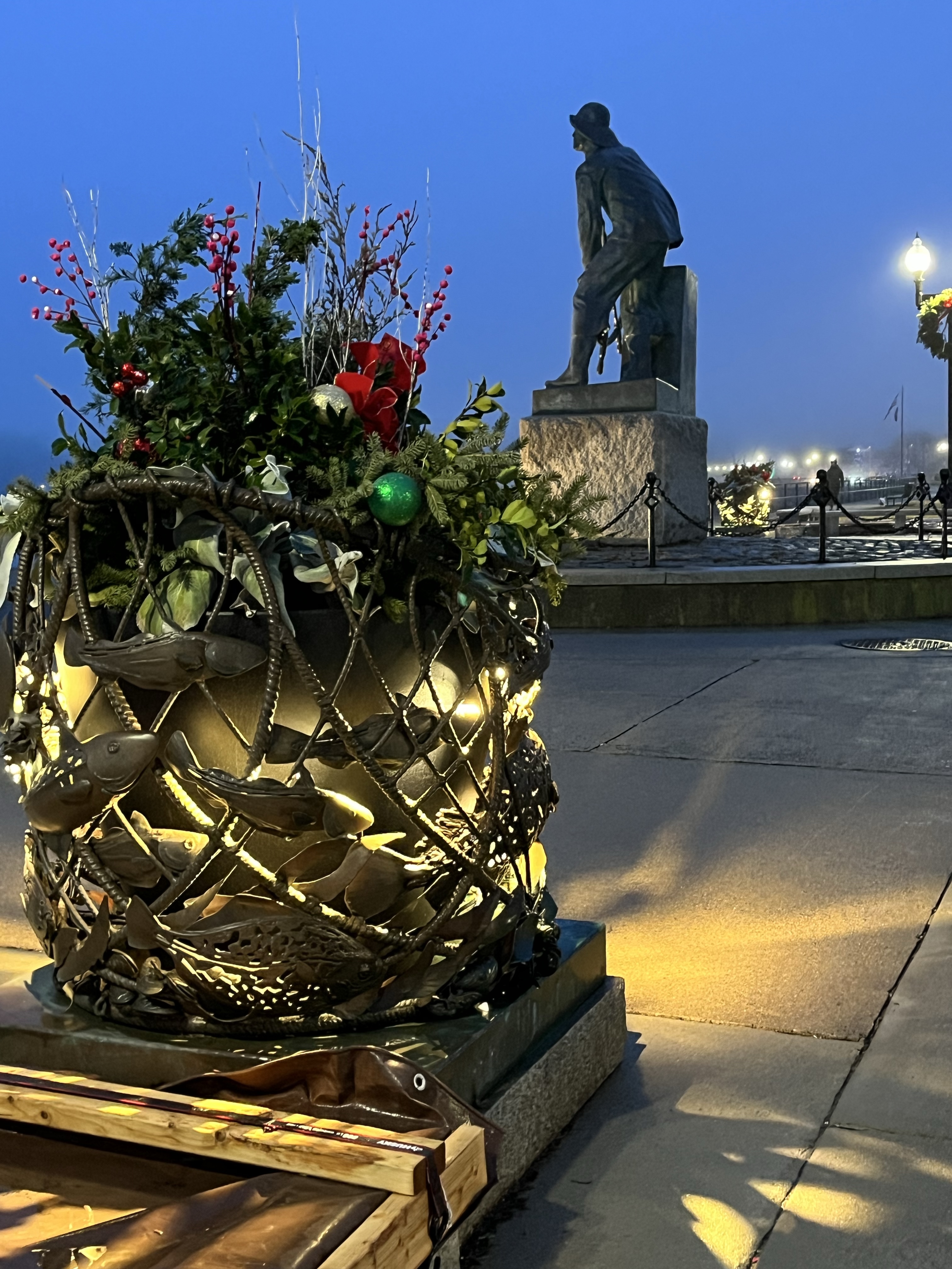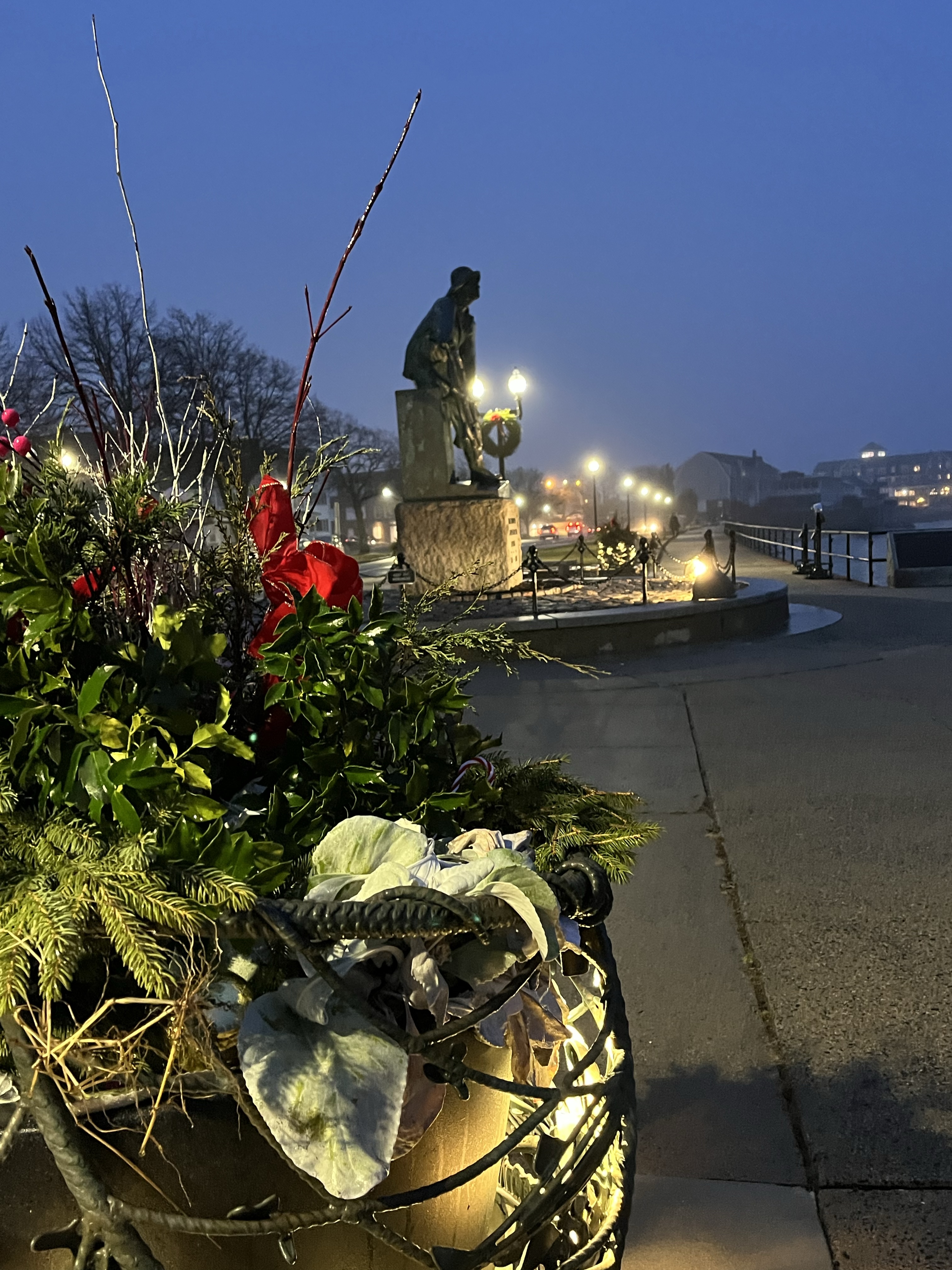 Dusk was falling quickly on a recent afternoon and the special effects of the lighting on our Man at the Wheel Memorial statue struck me as being strikingly beautiful. Thought you might agree.