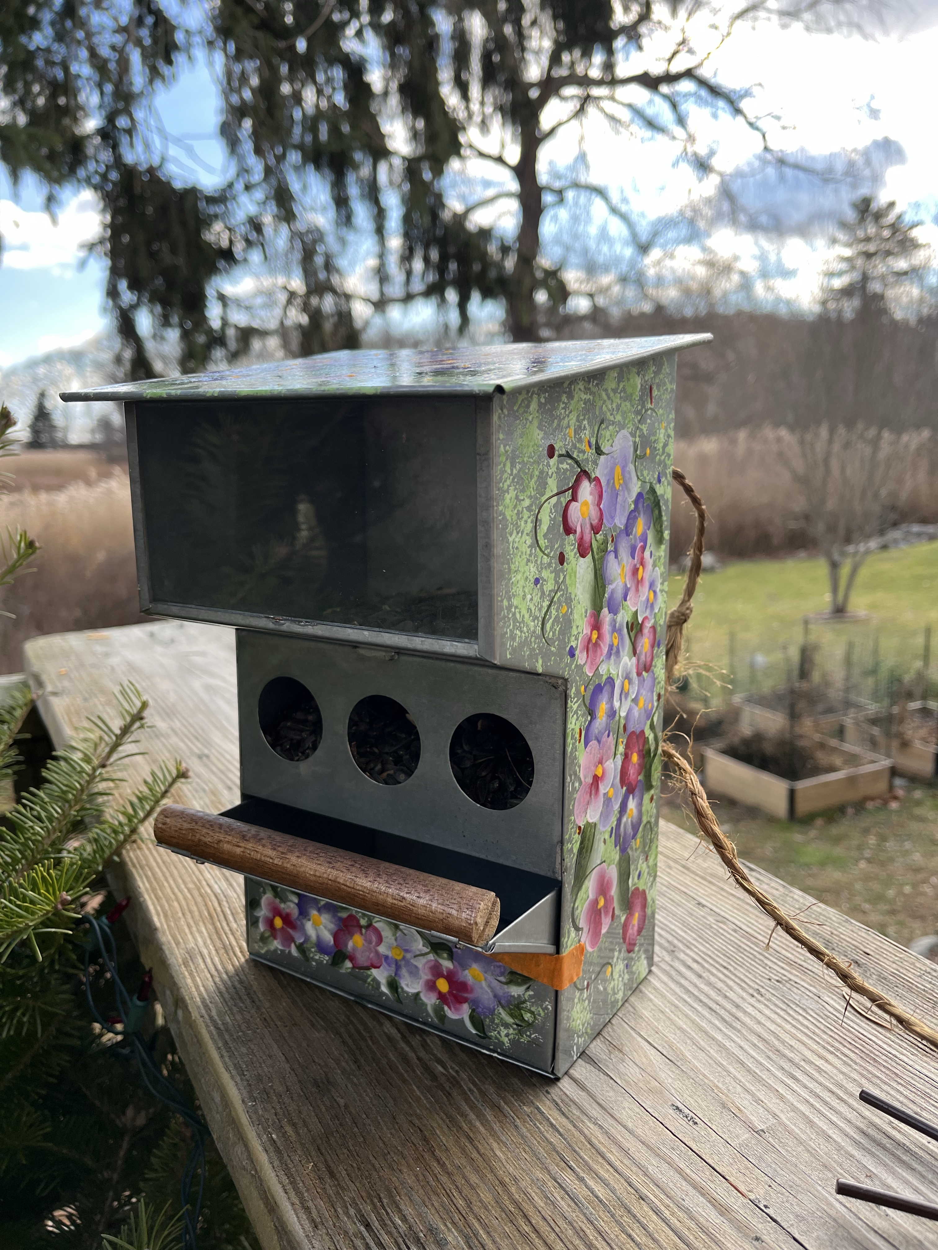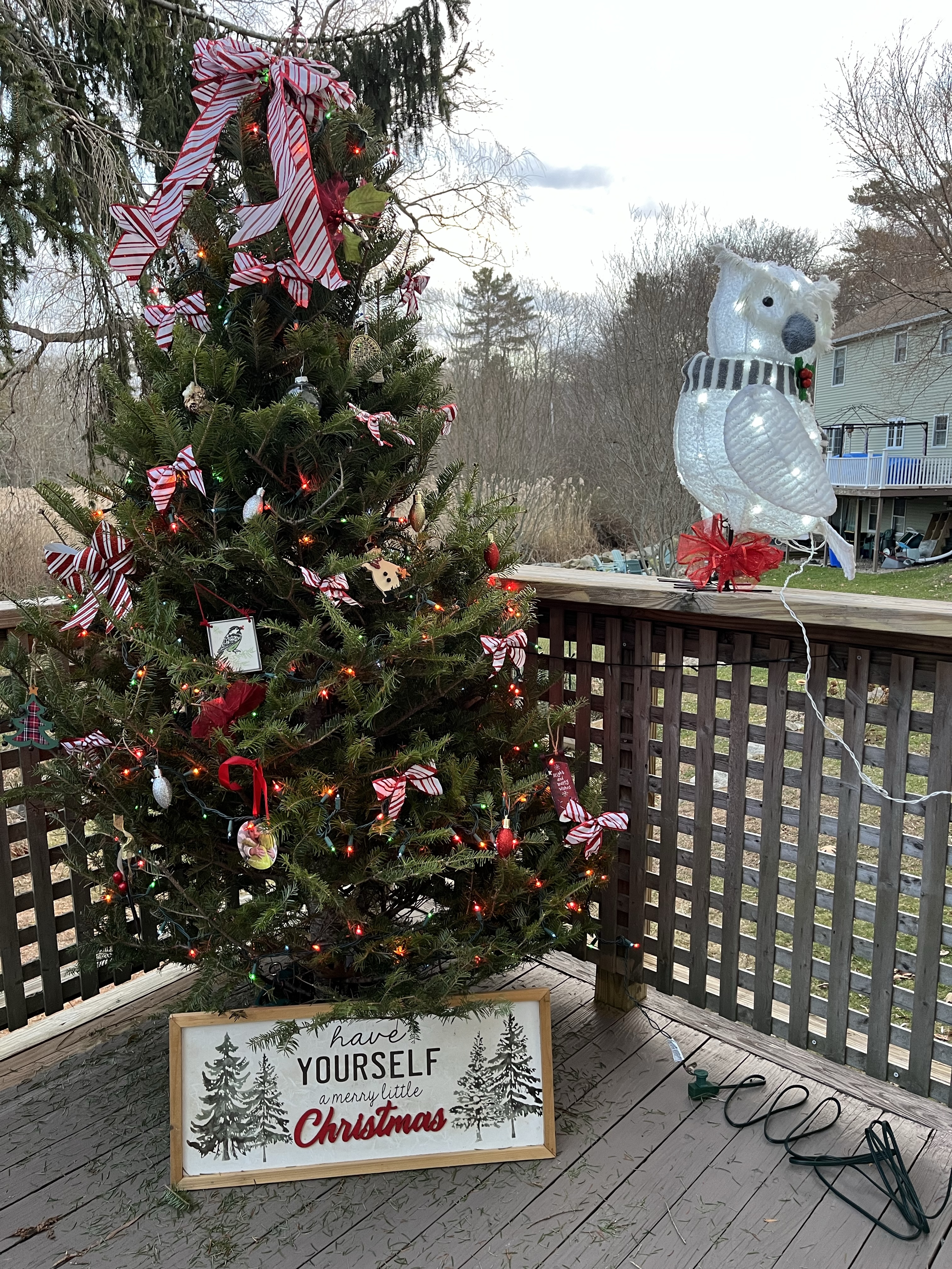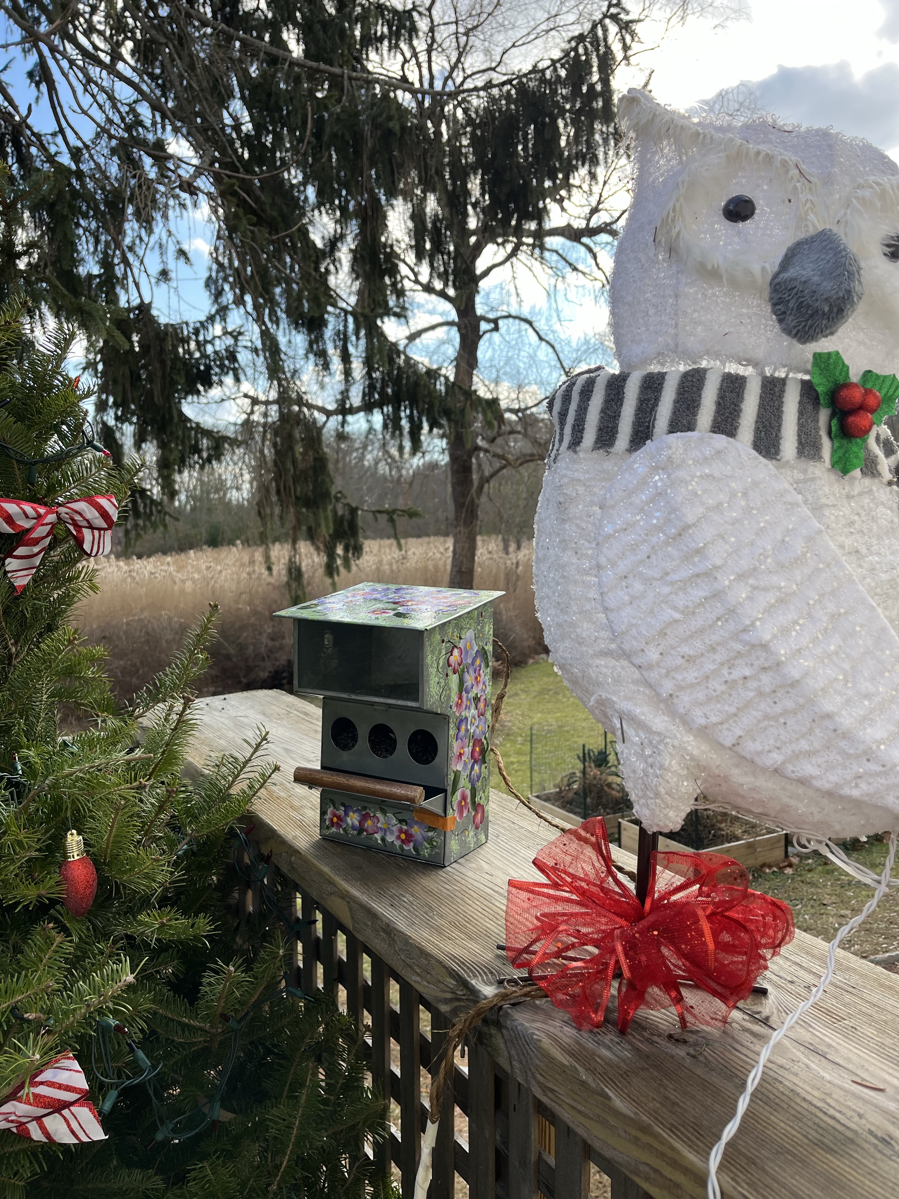 I received an ear.ly Christmas gift from Jim recently to help “fancy up” our outdoor tree set up: a new bird feeder from Pauline’s Gifts on Essex Ave! It’s gorgeous and a great complement to our holiday outside decor. I’d been bugging him to get the bird seed replenished and he’d been holding off because he had the new bird feeder hidden away. Apparently the poor songbirds in our yard added to the chorus and he relented and presented the gift early. I’m glad to have such a beautiful locally made item displayed proudly for this holiday season. Thanks to all who have been shopping locally. It means a great deal to each and every shop. Special thanks to Pauline for her wonderfully creative gift ideas.