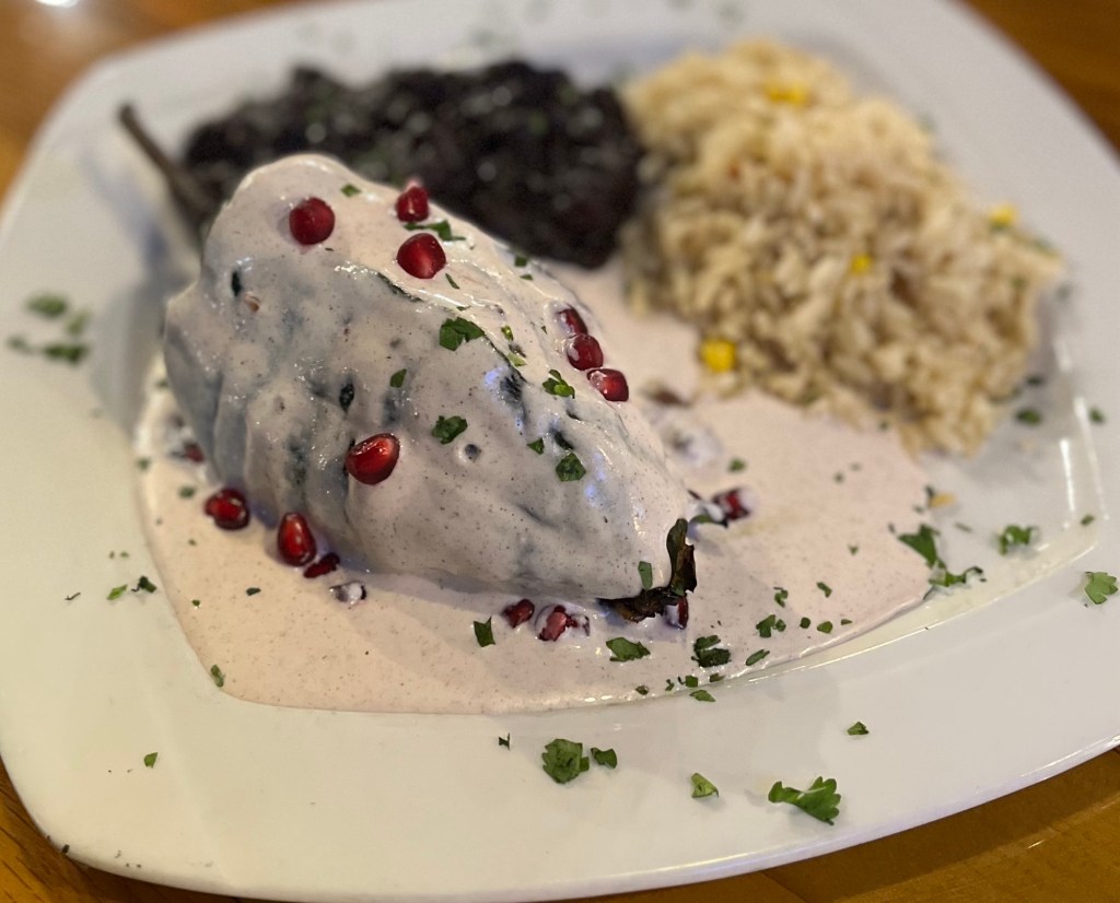 A roasted poblano pepper stuffed with a savory blend of ground beef, dried fruits, and warm spices, topped with a silky walnut sauce and sprinkled with vibrant pomegranate seeds.