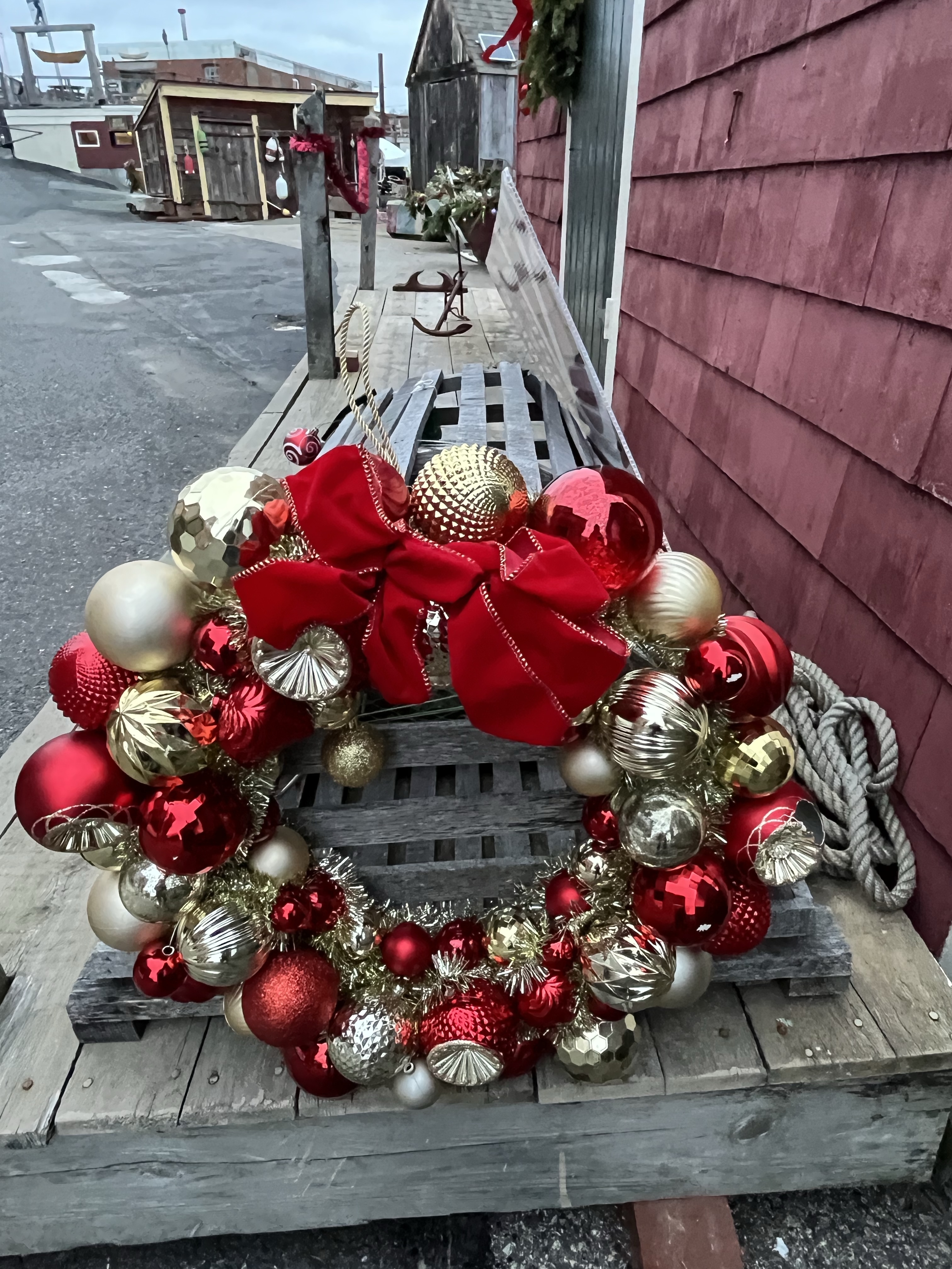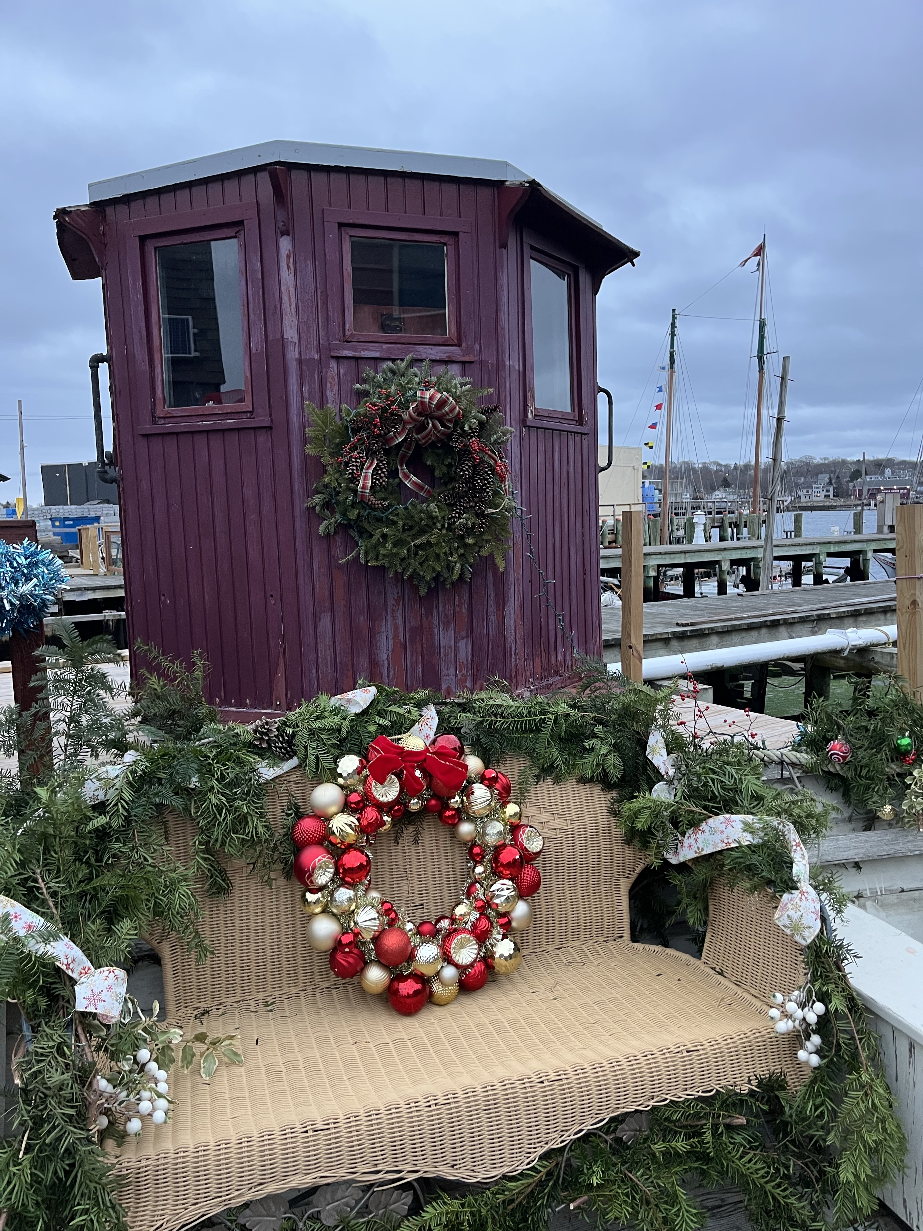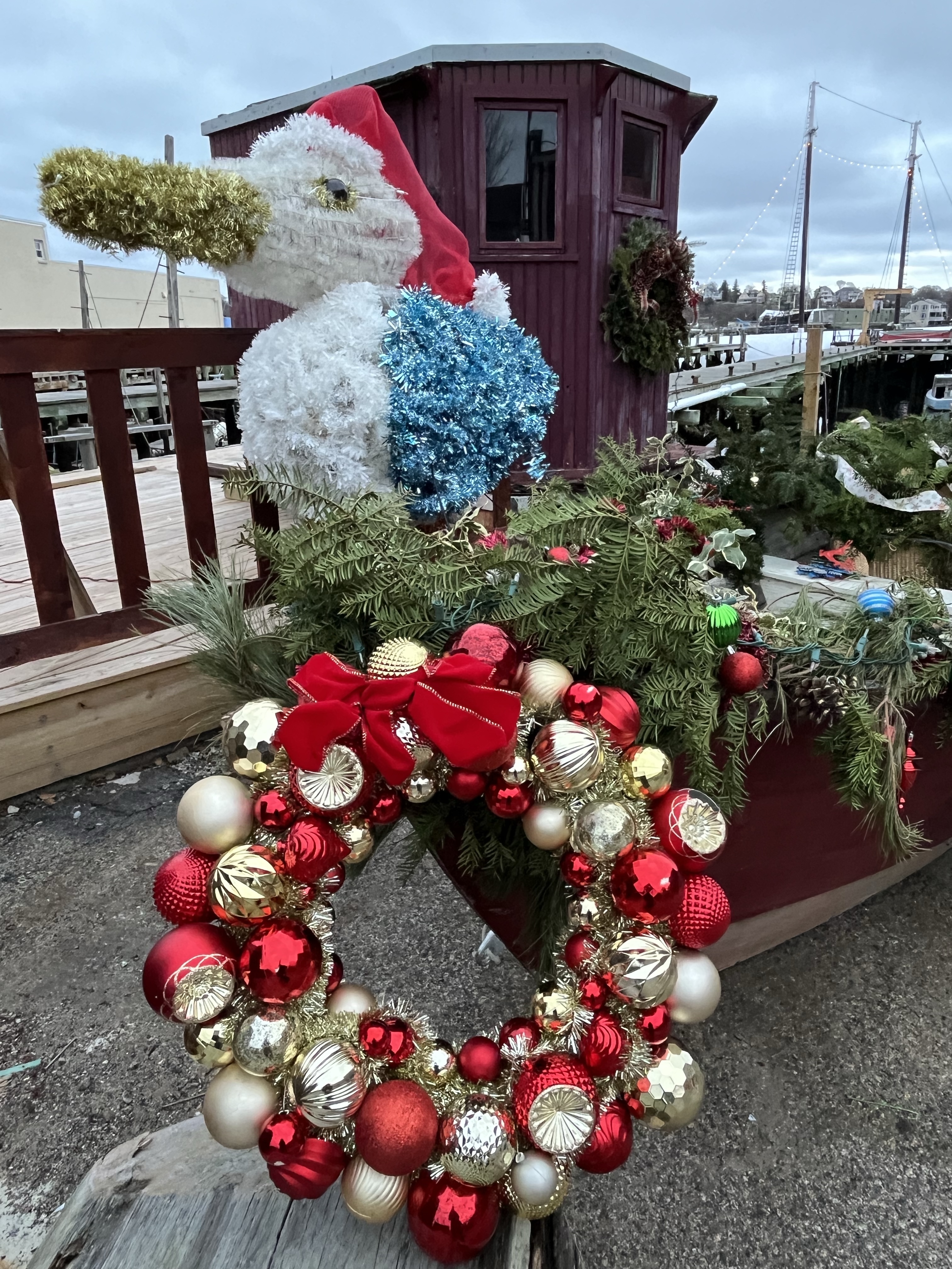 Some of you may remember Keith the Wreath. He’s a little beat up but he still likes to make stops around Gloucester to see what’s new. He began his tour this year at the Maritime Dock which is decked out for the holidays. If you’re looking for a way to feel merry and bright, start here. If you’d like to meet Keith and perhaps have your own picture taken, stop by 44 Main St until 5 today and Sunday/Monday 11-3.