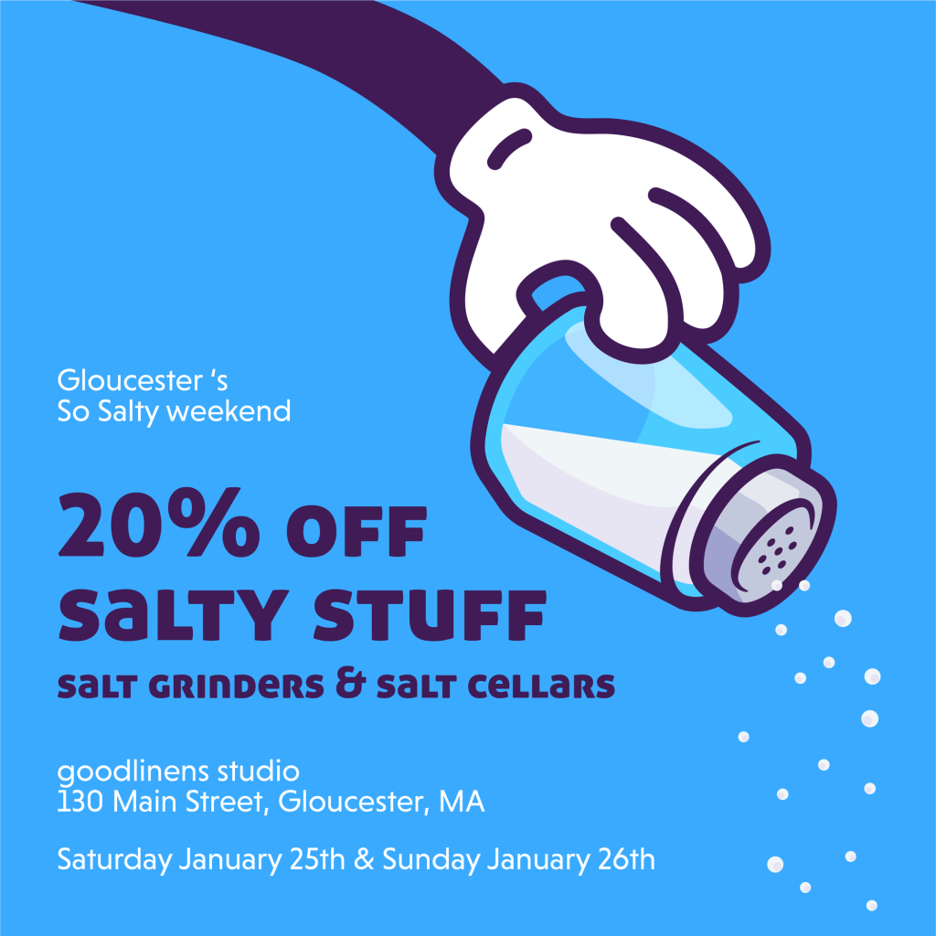 20% off all salt grinders and salt cellars, Goodlinens Studio, 130 Main St.