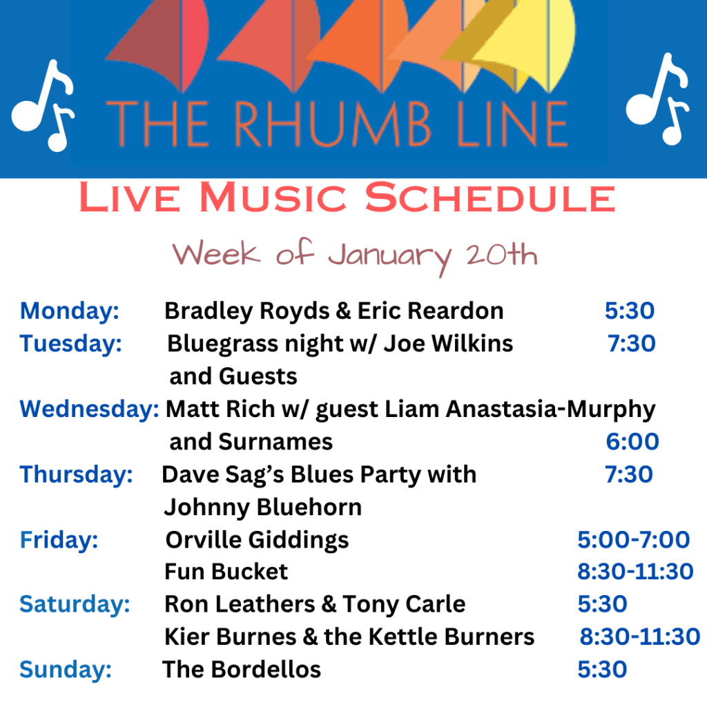 Here’s this week’s live music schedule at the Rhumb Line! See you there.