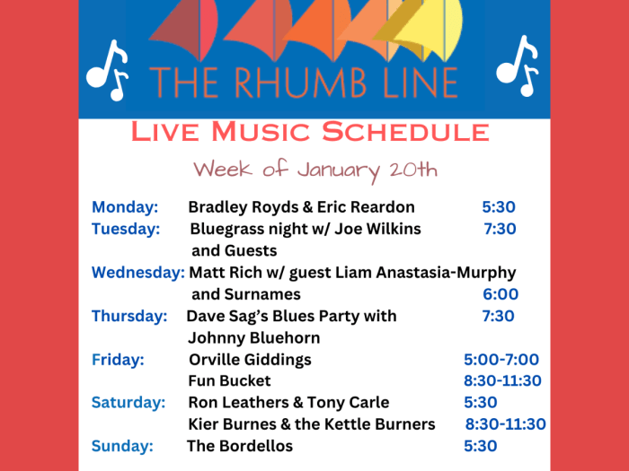 Here’s this week’s live music schedule at the Rhumb Line! See you there.