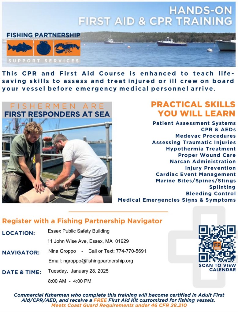 a free Fishermen’s First Aid & CPR course on January 28at the Essex Public Safety Building, 11 John Wise Avenue, 8am-4pm