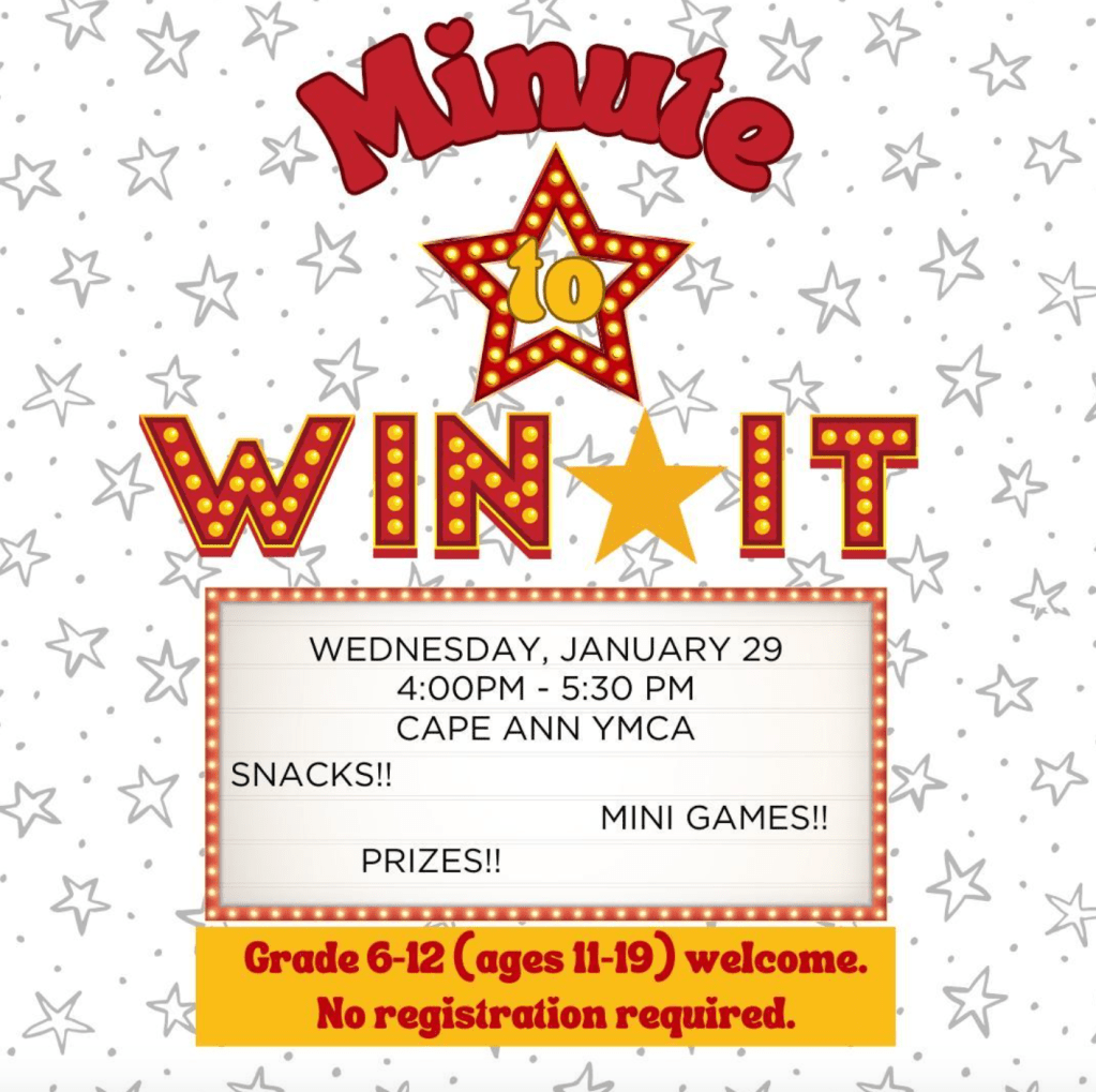 Calling all tweens and teens—it’s your time to shine! Join the Sawyer Free Library at the Cape Ann YMCA on Wednesday, January 29, from 4:00 to 5:30 pm for an afternoon of snacks, mini-games, and friendly competition. We’ll test your skills and smarts, and you could walk away with prizes—so be sure to bring your A-game and a friend! No registration is required, and all materials will be provided. This event is open to anyone in grades 6–12 (ages 11–19). For more information, visit sawyerfreelibrary.org or 978-325-5500. Don’t let the winter blues slow you down—come get active, have fun, and win big!