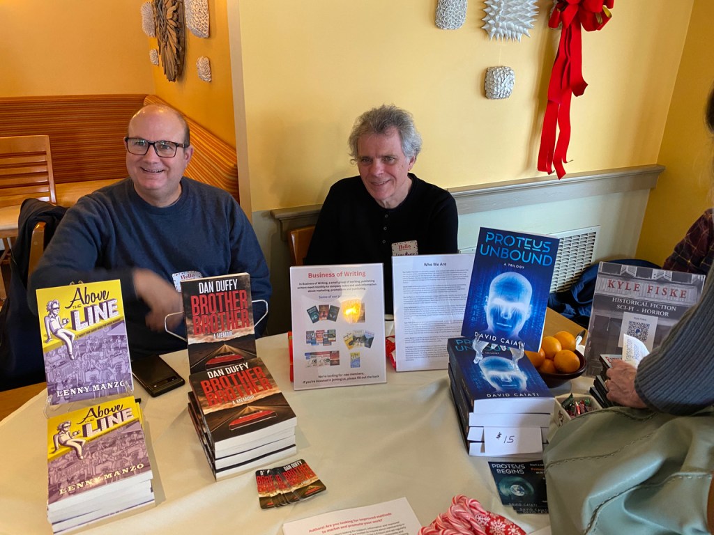 David Caiati and Lenny Manzo. Members of the Business of Writing group at Literary Cape Ann’s annual Holiday Book Fair at Brackett’s Oceanview Restaurant in Rockport. On display are some of their books.