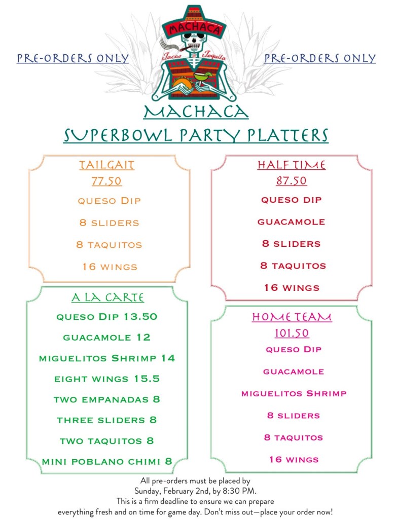 Score big this Super Bowl with delicious, fresh platters and snacks from Machaca! Whether you’re hosting the ultimate party or just kicking back with friends, we’ve got everything you need to make game day unforgettable.