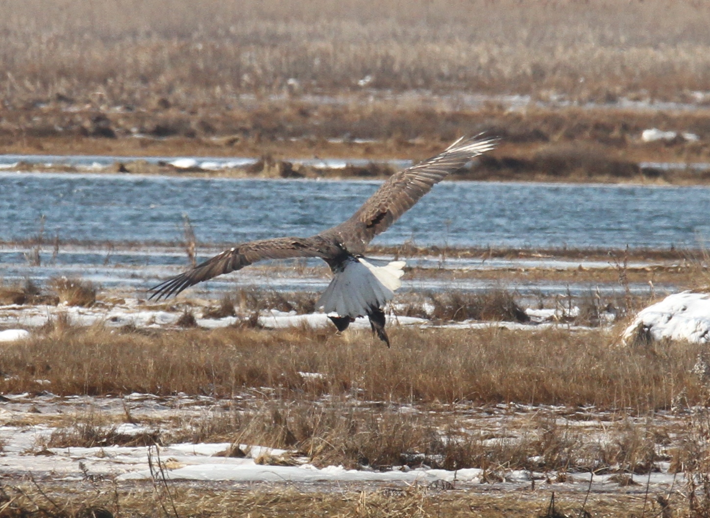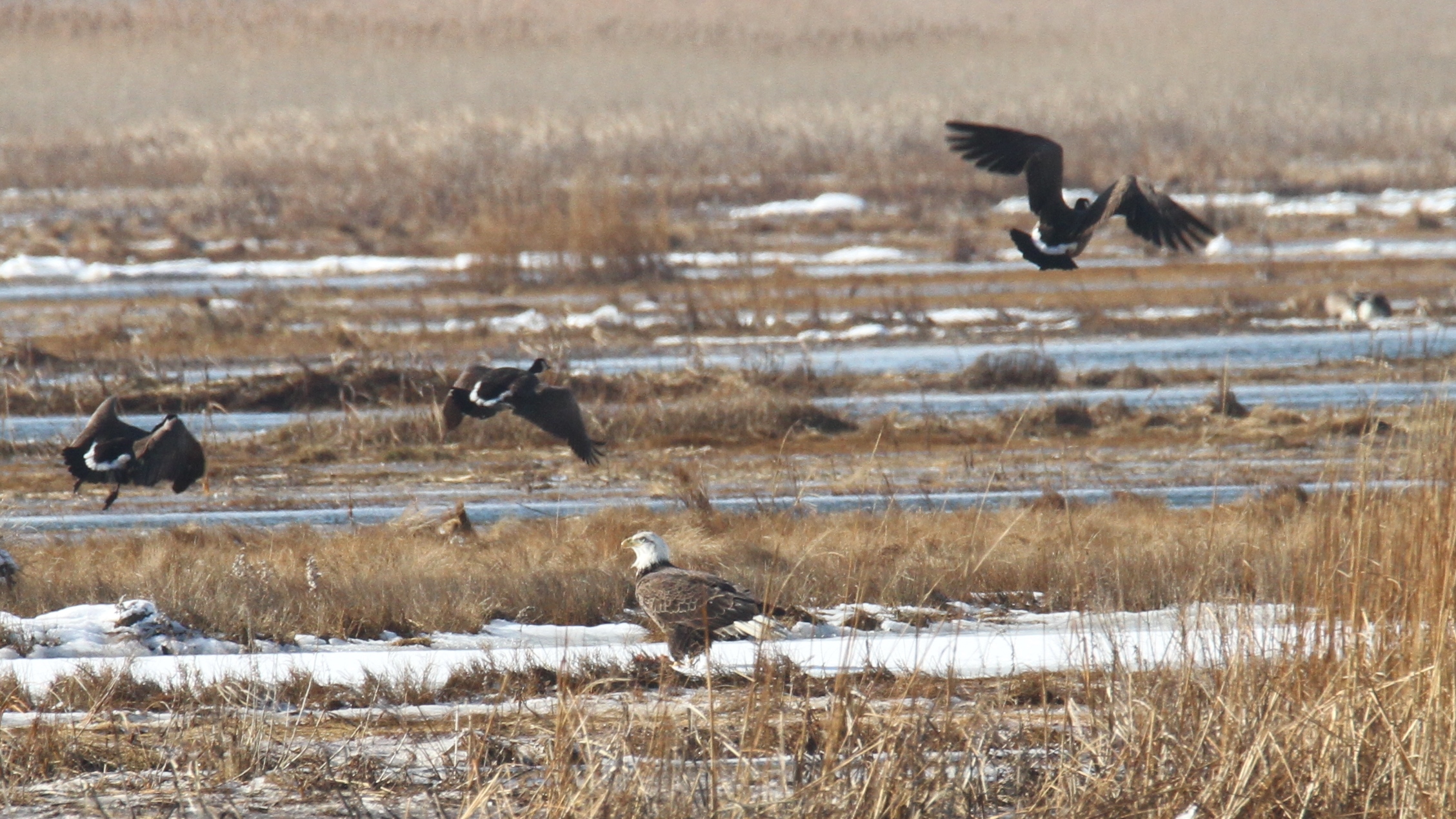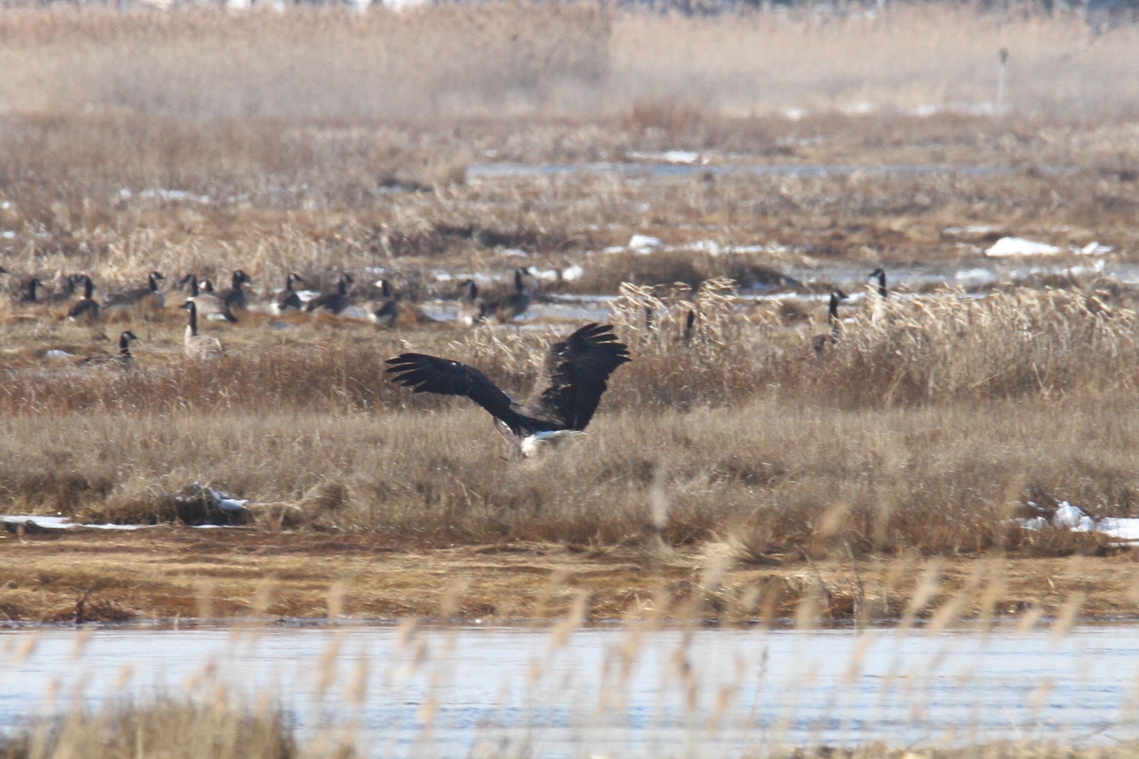 We were treated to an episode of Mother Nature Doing Her Thing at Salisbury Beach State Reservation recently. We watched an eagle pounce on its prey and then carry it across the water to enjoy in the company of a flock of geese. Though I can’t be certain, I believe the prey was a duck. I recently learned that eagles like duck for a good meal and perhaps this is an example. Anyhow, the eagle feasted for a while and the geese moved a short distance away. A harrier hawk did a quick fly by to see what was what. The eagle moved its prey again landing closer to the geese. We watched for several minutes in awe of nature. Oh, and there was a hawk sitting prettily in a tree also! What a day. For additional photos and story details, check out Pat D’s Photos and Adventures on Facebook. This post is for FOB Paula Ryan O’Brien’s birthday! Happy birthday to you.