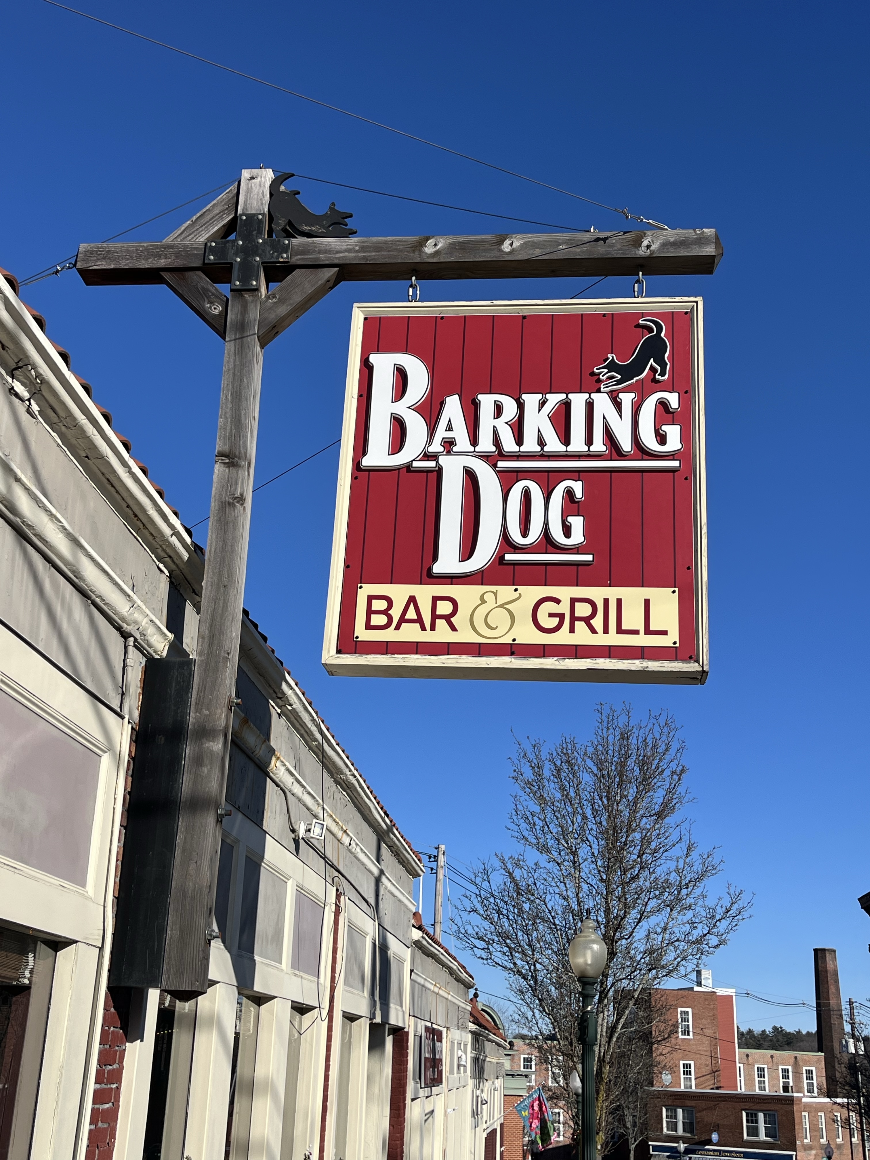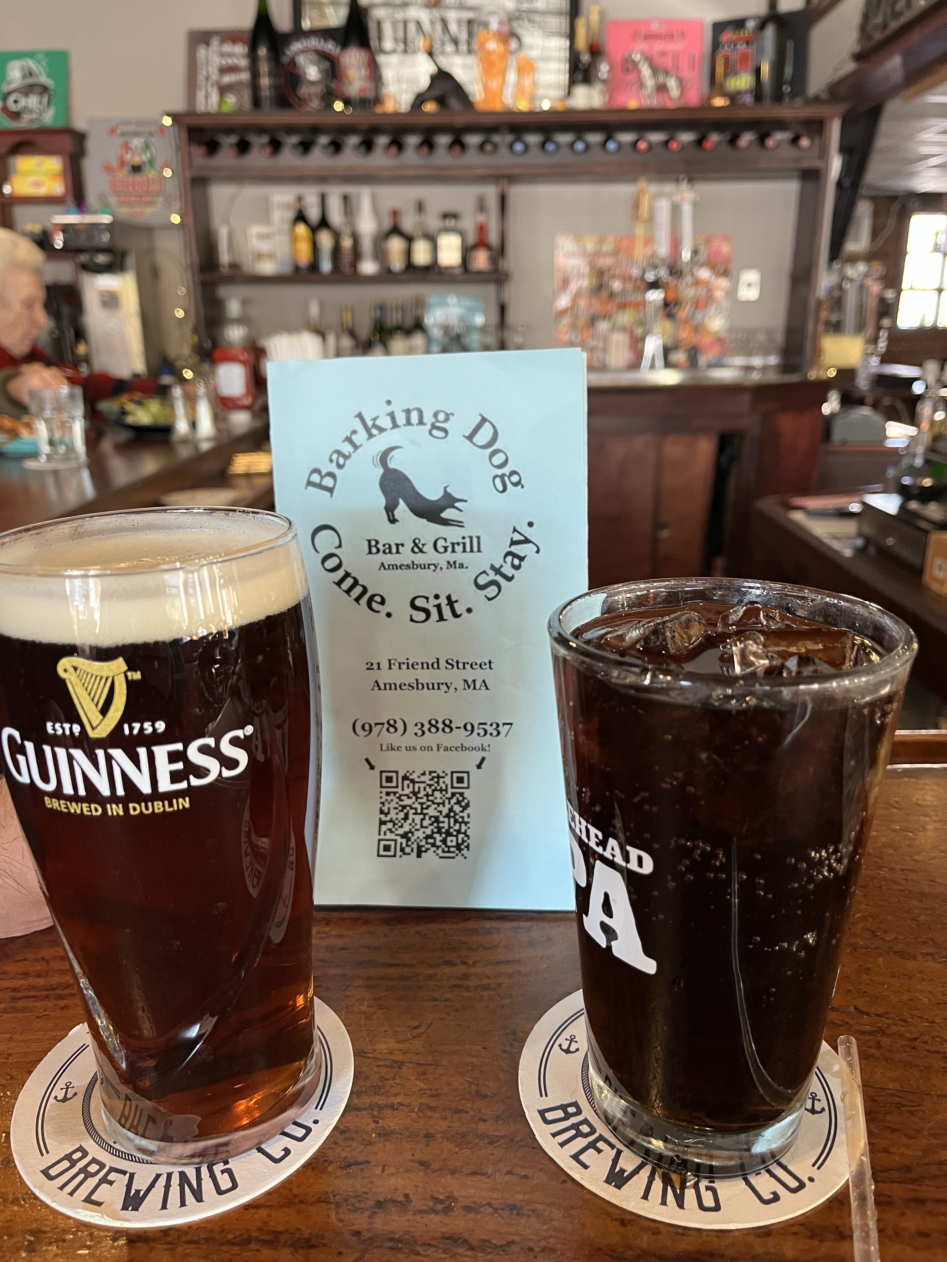 As I reported a while back, we ventured to Amesbury in search of waterfalls. We found the waterfalls and had a nice little walk around. We decided to stop at the Barking Dog on Friend St in Amesbury for lunch. I thought of all our Gloucester dog lovers as the whole place is themed just for you. It’s a small friendly pub very close to the waterfalls. Comfy and welcoming, the customers that day included a range from families to senior citizens so it obviously pleases a wide demographic.