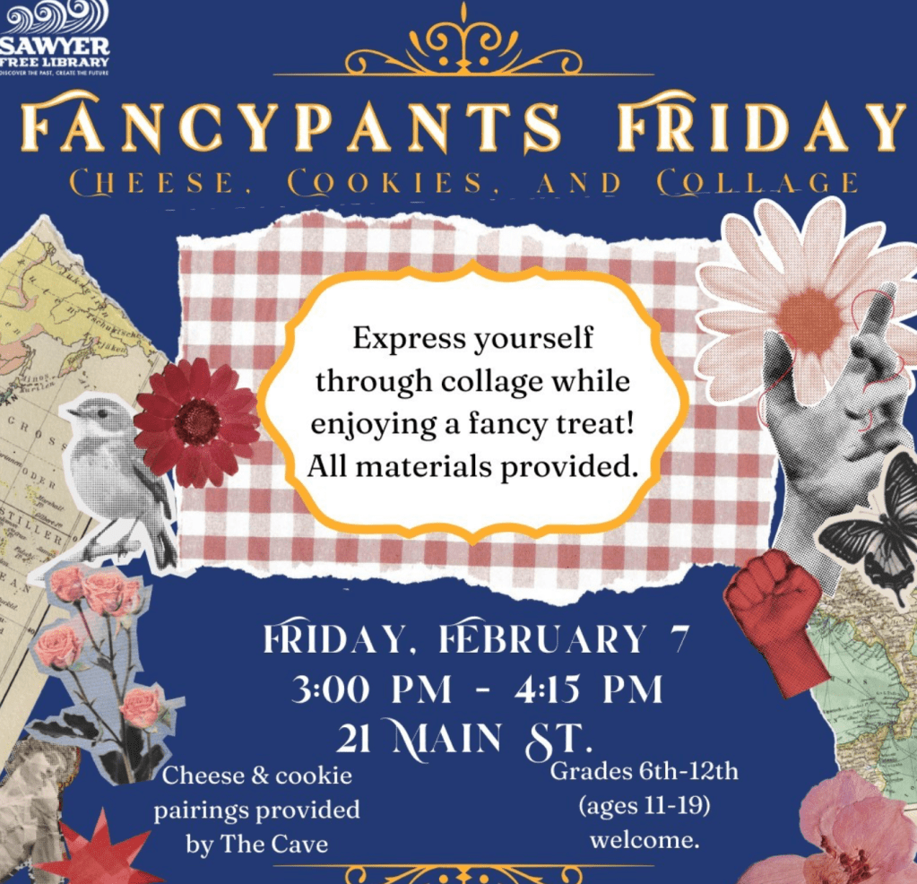 Teens and tweens, start your weekend off with a fancy flair! Join the Sawyer Free Library on Friday, February 7 from 3:00 to 4:15 pm for an afternoon of collage-making and cheese and cookie pairings from The Cave.