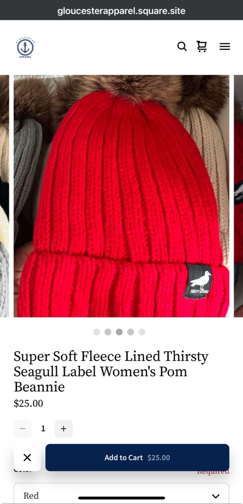 Link to order- https://gloucesterapparel.square.site.square.site/product/super-soft-fleece-lined-thirsty-seagull-label-women-s-pom-beannie/69