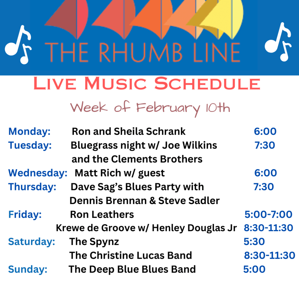 Here is this week’s live music schedule at the Rhumb Line. See you there!