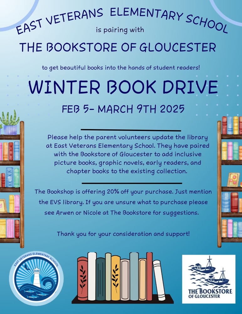 The EVS Book Drive runs until March 9th! https://www.thebookstoreofgloucester.com/