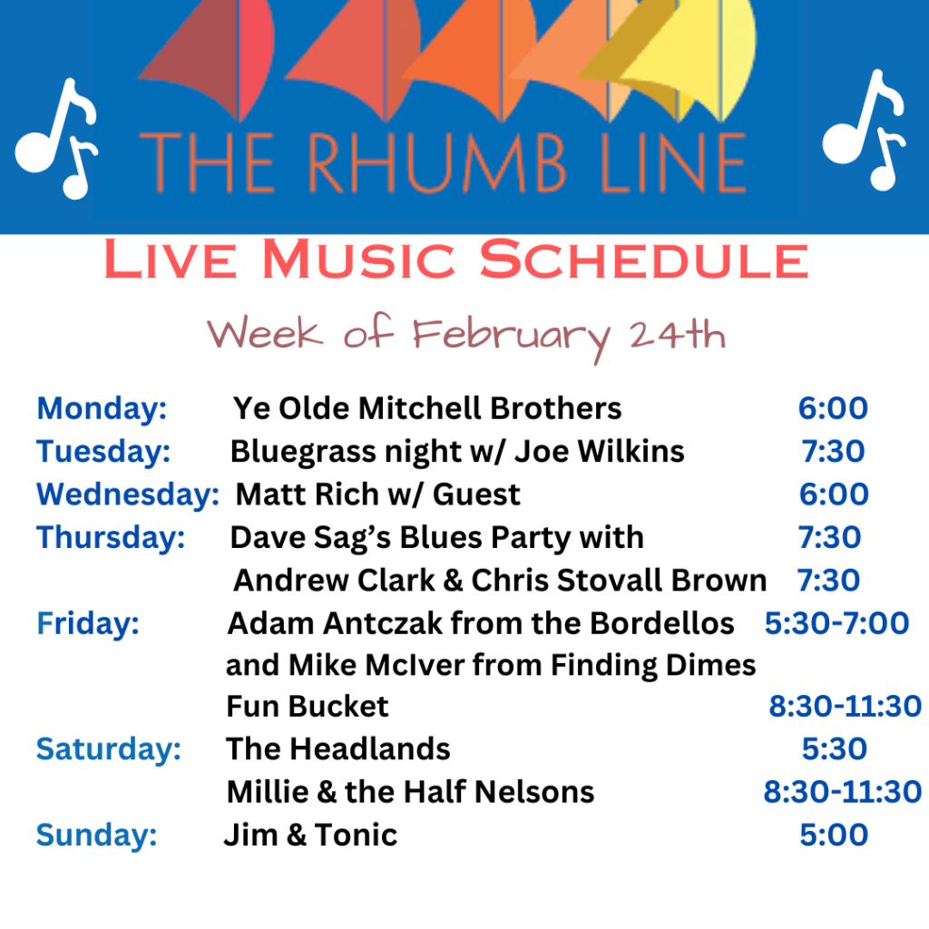 This week’s live music schedule at the Rhumb Line. Have you been recently? If not, you should. Live music seven days per week with a variety to satisfy everyone’s musical tastes.