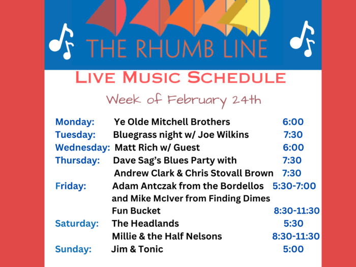 This week’s live music schedule at the Rhumb Line. Have you been recently? If not, you should. Live music seven days per week with a variety to satisfy everyone’s musical tastes.
